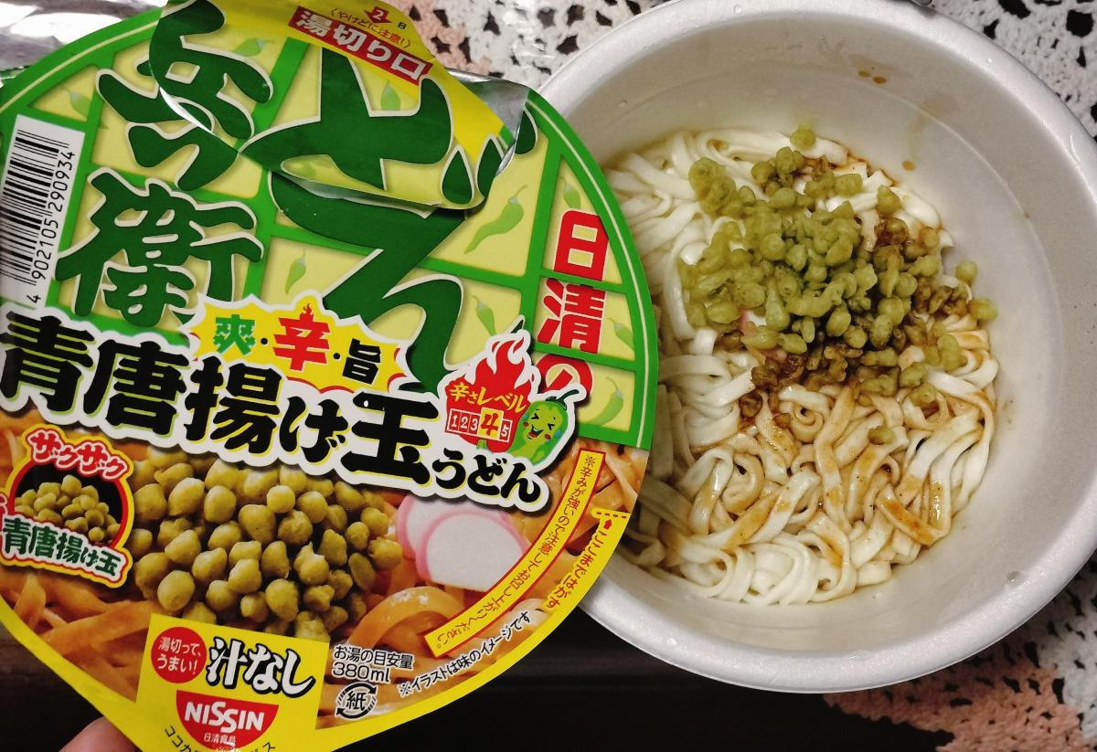 どん兵衛のうどんが好きなので、汁なしでのアレンジも楽しんでいます。麺がもちもちで、つるっと食べられる喉ごしが気持ち良いです。昆布とかつおのだしは香りが良くて、濃い味わいでごはんが欲しくなりました。青唐揚げ玉は初めてでしたが、サクサクとしていて、さわやかな辛み!全体的にさっぱりとしていて、食欲がない時にもおすすめです。あとは具がかまぼこしかないので、わかめを足したいなと思いました。
