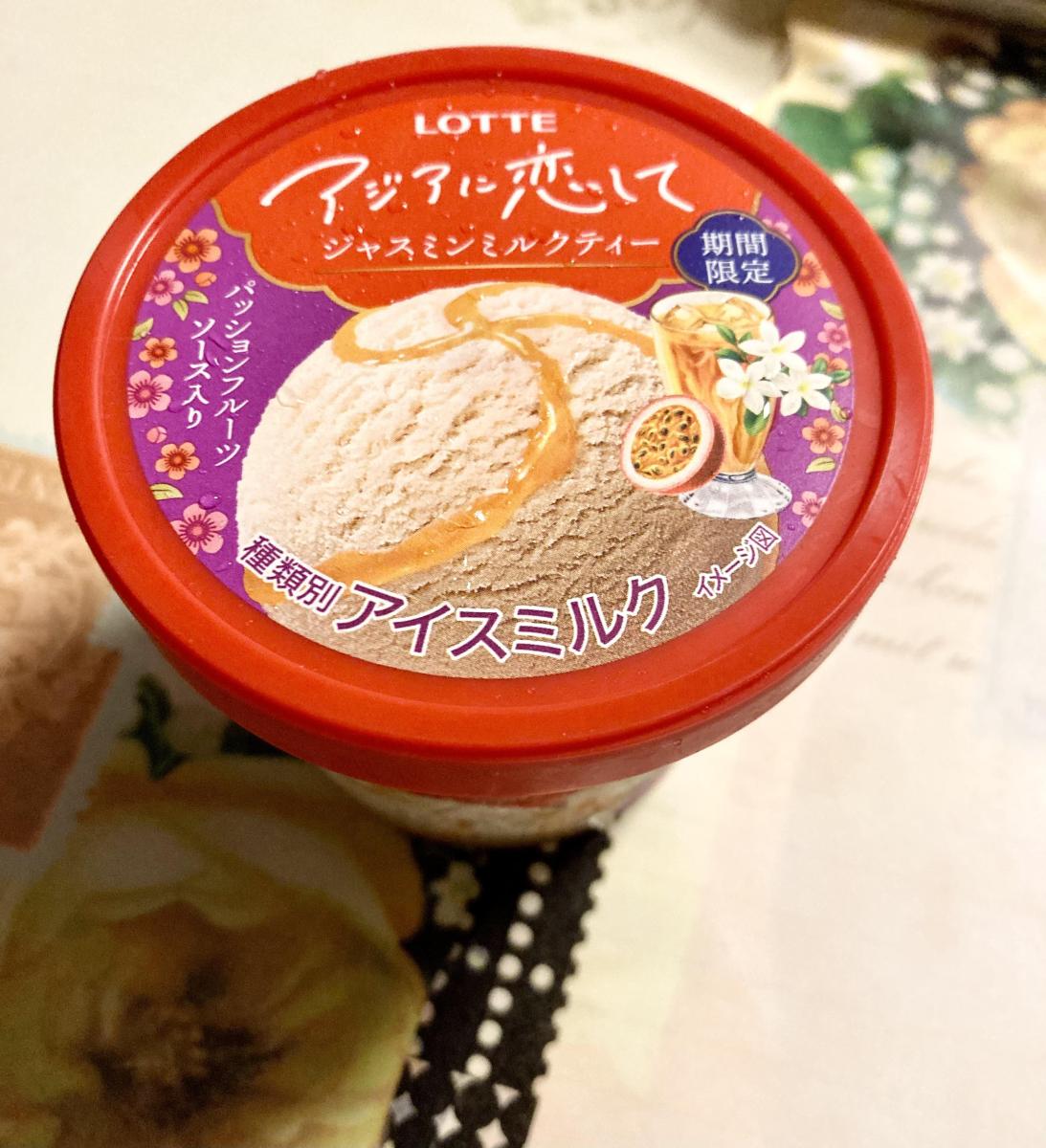 アジアに恋して ジャスミンミルクティー味のネーミングに惹かれてどんな味か試したく購入してみました。ジャスミンミルクティーアイスはふんわりくちどけなめらかな食感です。コクのあるミルクの味わいにジャスミンの香りがしっかり広がります。パッションフルーツソースは甘酸っぱく美味しい味わいでした。香りが好き嫌い分かれるかも