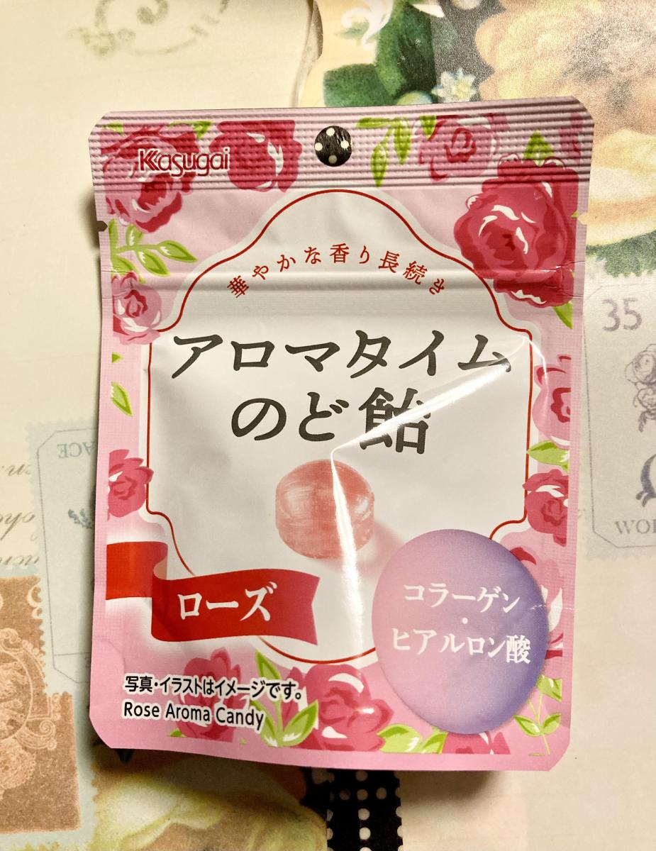 アロマタイムのど飴 ローズ味のネーミングとパッケージに目が惹きどんな味か試したく購入してみました。 口いっぱいにバラの香りが広がり甘さも結構感じます。 13種類のハーブエキス、コラーゲン、ヒアルロン酸、バラ花びら抽出物が配合されているそうで、女子ウケぴったりです。ハーブはそこまで感じず、のど飴感はあまりないかな。ローズ好きにはぴったりです。