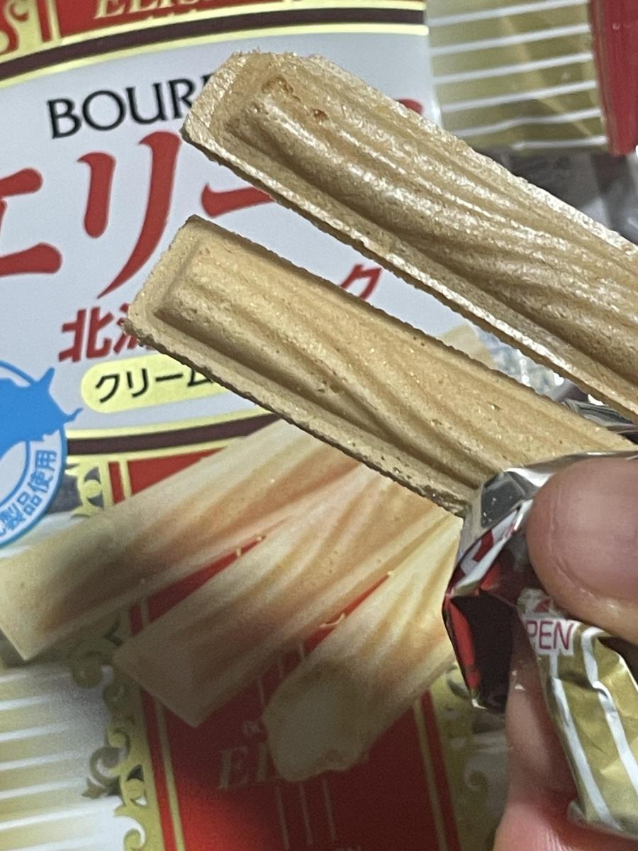 ウエハースより軽い食感でサクサクしたパフ生地の中に、練乳クリームというか、まぁマーガリンみたいな感じのクリームがいます