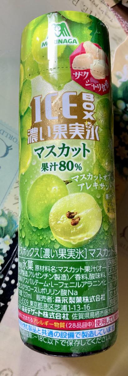 アイスボックス濃い果実氷のマスカット味が気になり購入してみました。果実80%の濃いマスカットの甘さとシャリシャリとした冷たさがすーっとしみておいしいです!暑い時にも食べられるぴったりな味わいです。そのままでも美味しいですが、炭酸を入れてみると大変美味しい味わいになりました。