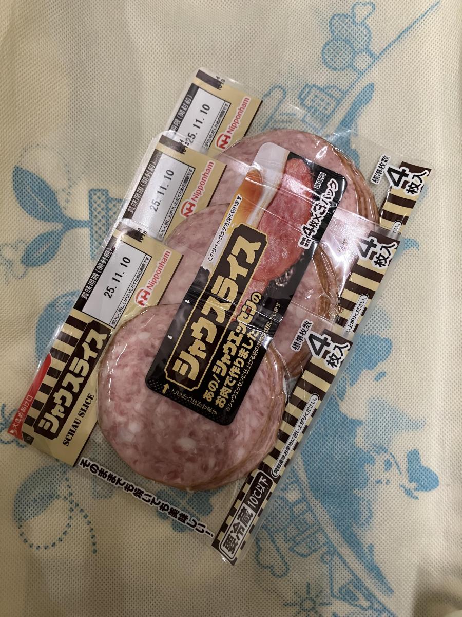 材料のお肉がシャウエッセンと同じスライスハムです。一枚は薄くスライスされてますが、ジューシーさと肉の旨みがしっかり際立つ味付けになっていて美味しいです。