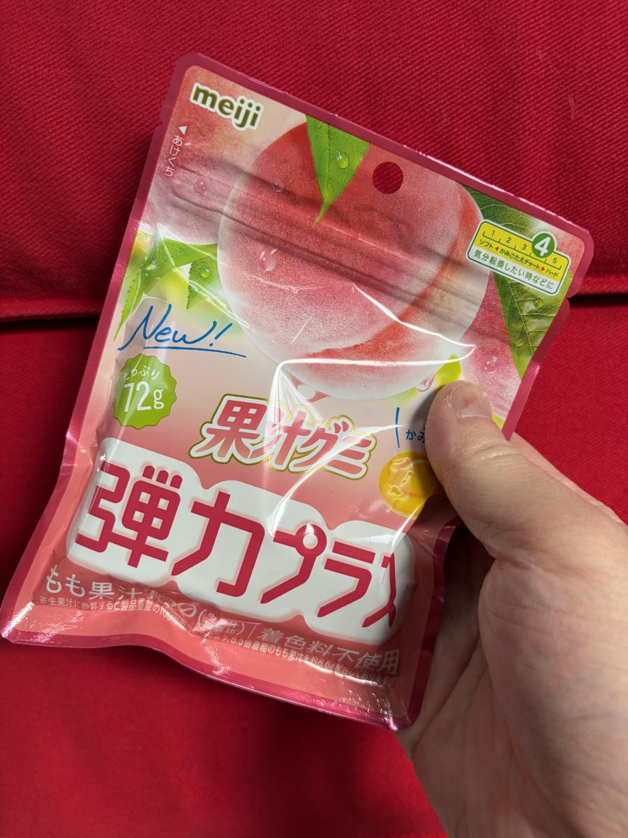 桃の香りを存分に楽しめる硬めのグミでした。噛むというのはストレス解消にもなるので良いですね。果汁をたっぷり使っているという商品なので香りも味も良いです。贅沢な気持ちになりますね。