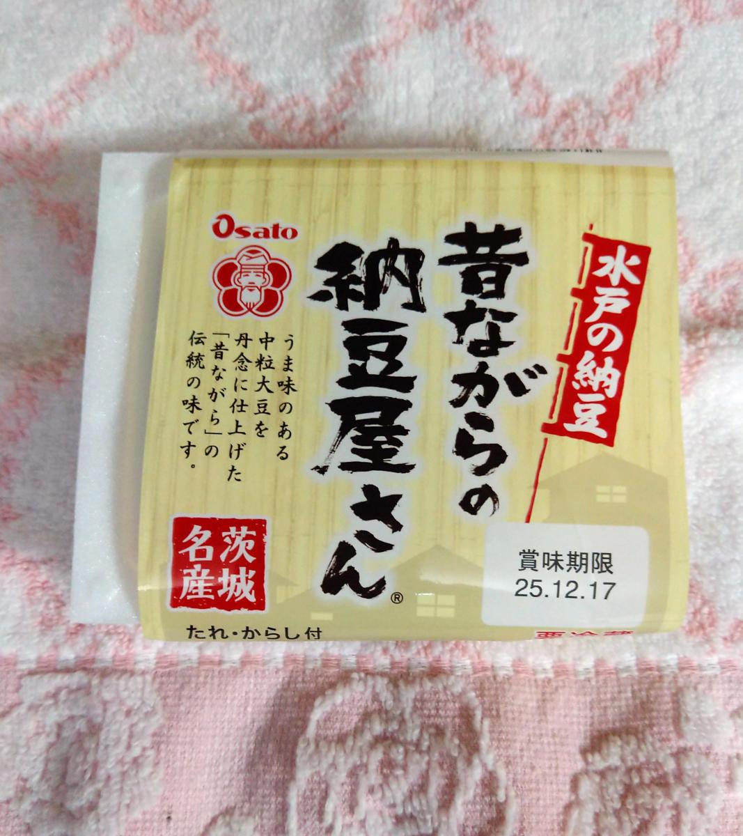 出汁の旨みが効いたタレ付きの納豆です。粒はやや大きめですが食べやすいサイズで、商品名通りに昔ながらのスタンダードな納豆で、手頃な値段でコスパ高いです。