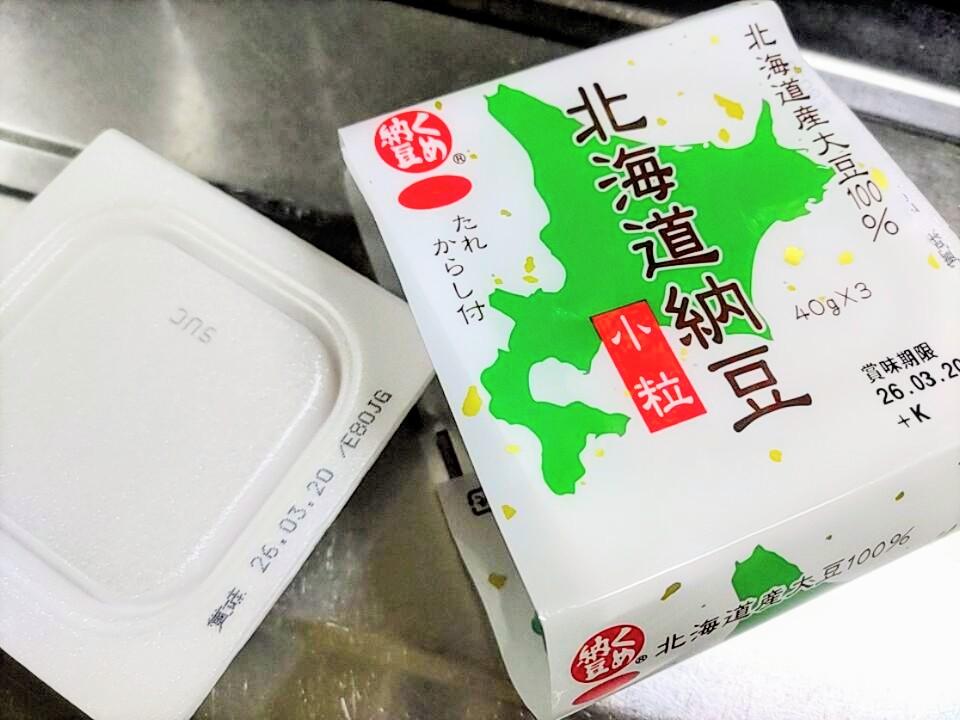 北海道の形が描かれたパッケージの北海道産大豆100%使用の北海道納豆。小粒ですが豆がしっかりしていて美味しいです。少し量が少ないせいかたれからし付きでも他より安くなっていました。国産で安く買えてとってもお得な納豆だと思います。