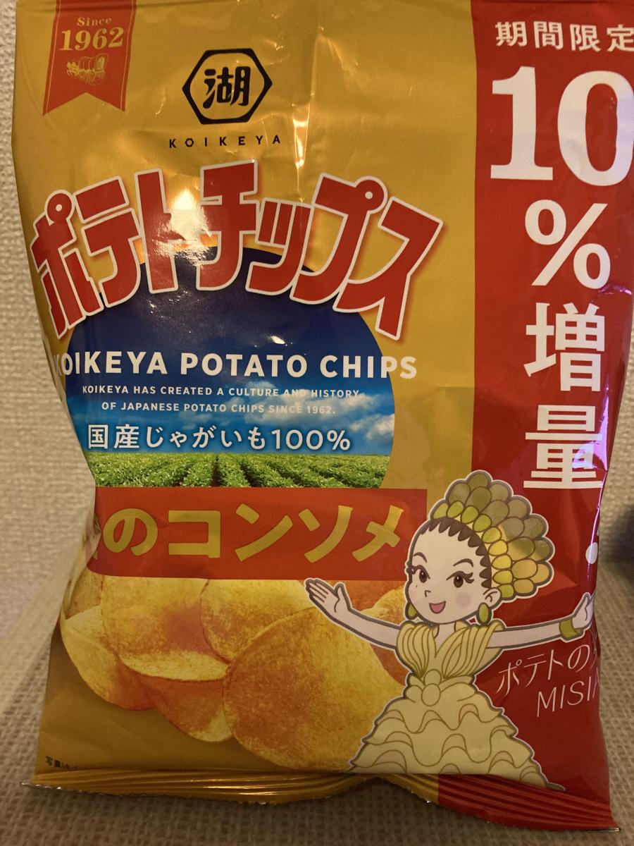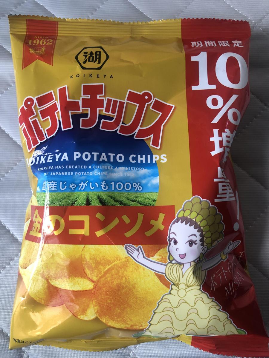 10%増量嬉しいです。コイケヤのポテトチップスは他のメーカーよりやや厚くスライスされているのでパリッと食感が良くて好きです。金のコンソメということで旨味も感じられて美味しかったです。