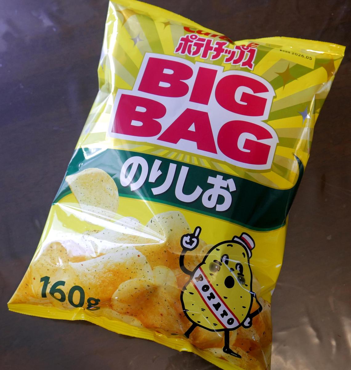定番ののりしおでございます。近所にマイバスケットが開店して記念セール品でビッグサイズがお安く売っていたので2袋も買ってしまいました。色々なテイストがでていますがポテトチップスの基本のお味ですね。パリパリッとした食感とシンプルなのりしお味があとひきます。食べ始めますと止まらなくなるのが少々コワイですね。孫も大好きで近々くるので一袋はキープです。