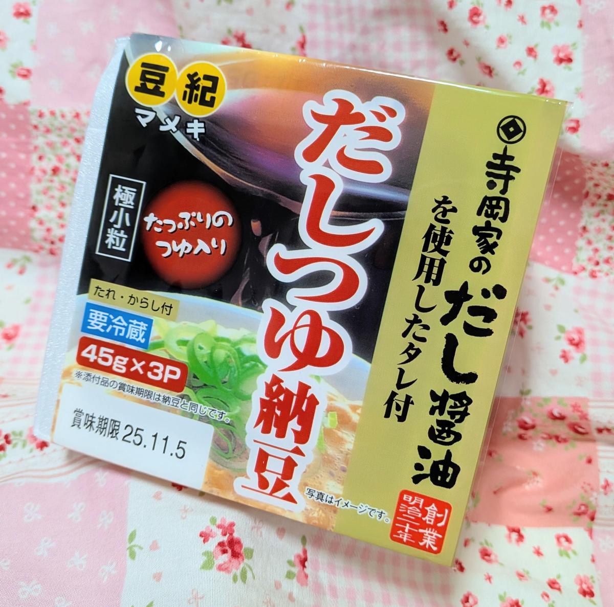 普段あまり見かけない納豆があって、寺岡家というのが気になって買ってみました。だしつゆにこだわりありとみました。確かにふつうの納豆よりだしがきいていてちょっと高級な納豆を感じました。ご飯にかけても美味しかったです。