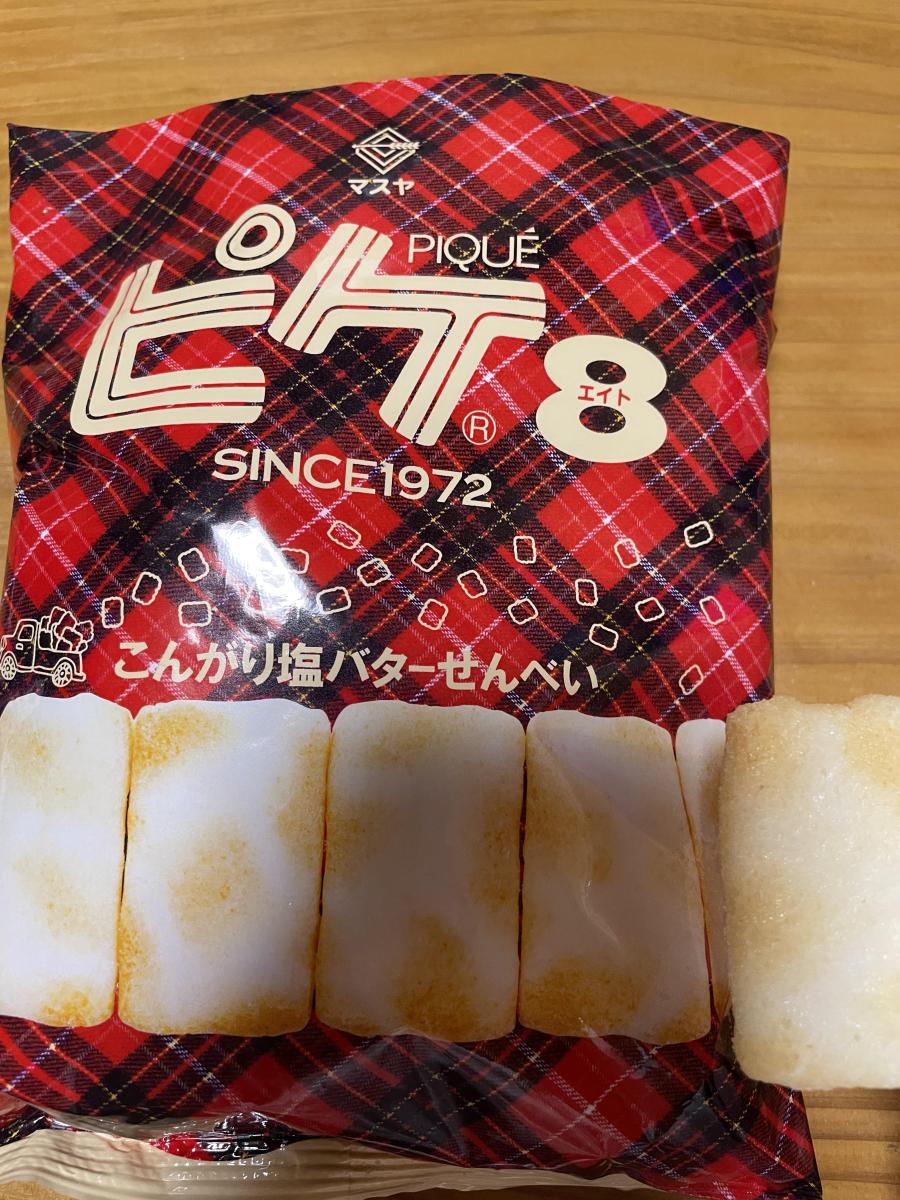 昭和の頃から馴染みのある塩系せんべい。タータンチェックのパッケージがずっと受け継がれていて、パッケージをちょっと目にしただけでピケ8だと分かりますね。塩系せんべい好きなので、某社サラダせんべいも良く買っていますが、この製品はバター風味あり。さすが洋風せんべいピケエイト。結構な年数ブランク期間があり、最近久々に購入。昔と比べるとパッケージ袋が小さくなっているのはちょっと残念でしたが、開封した途端に漂う香りにはちょっと驚き。バター由来の、まるでスイーツみたいな芳香。昔はここまでバターのアピールは無かった気がします。食べてみると、まるでせんべい版バタークッキーでまろやか味。謳ってある通り、北海道発酵バター、かなり利いてます。バターだけでなく塩気も十分。美味しく食べさせてもらいました。