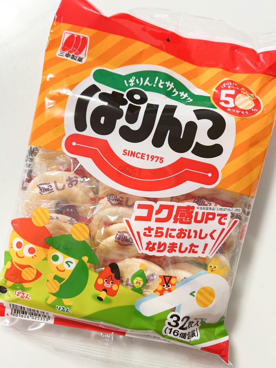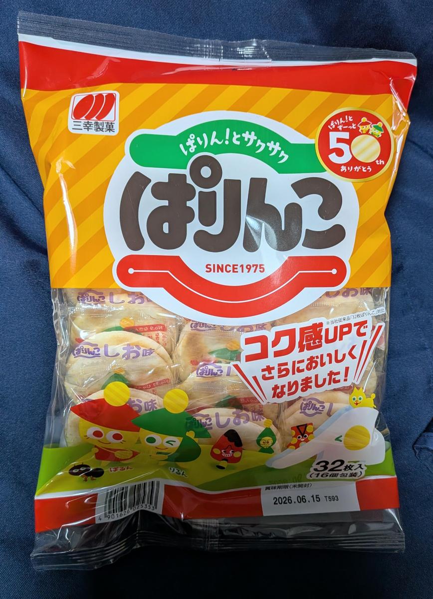 今年で50周年のようでかなりのロングセラー商品です。サクッとした煎餅にあっさりと塩味の利いたシンプルな美味しさでした。サイズ感もちょうどよく一口サイズが2枚入りの個包装になっていて全部で32枚もありました。緑茶とよく合うので一息つきたい時にぴったりです。