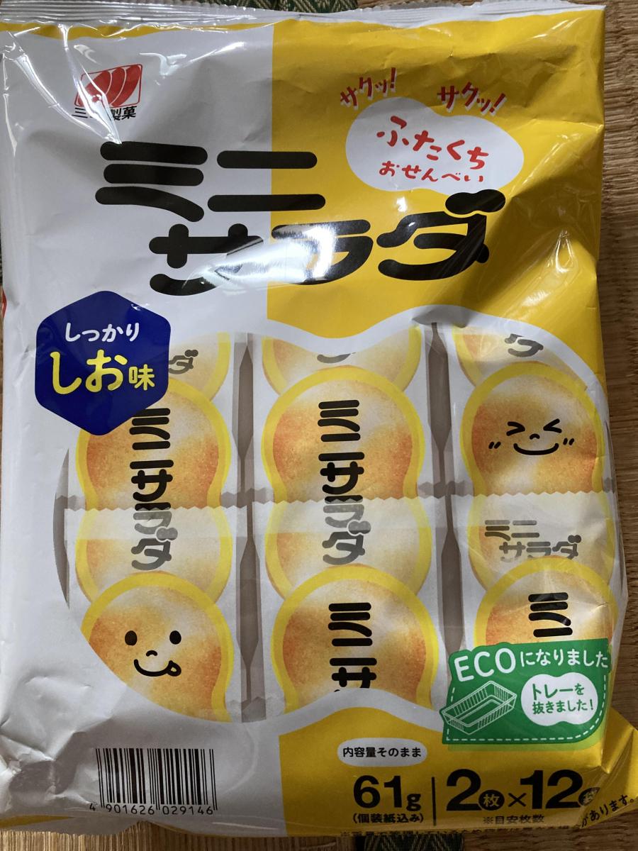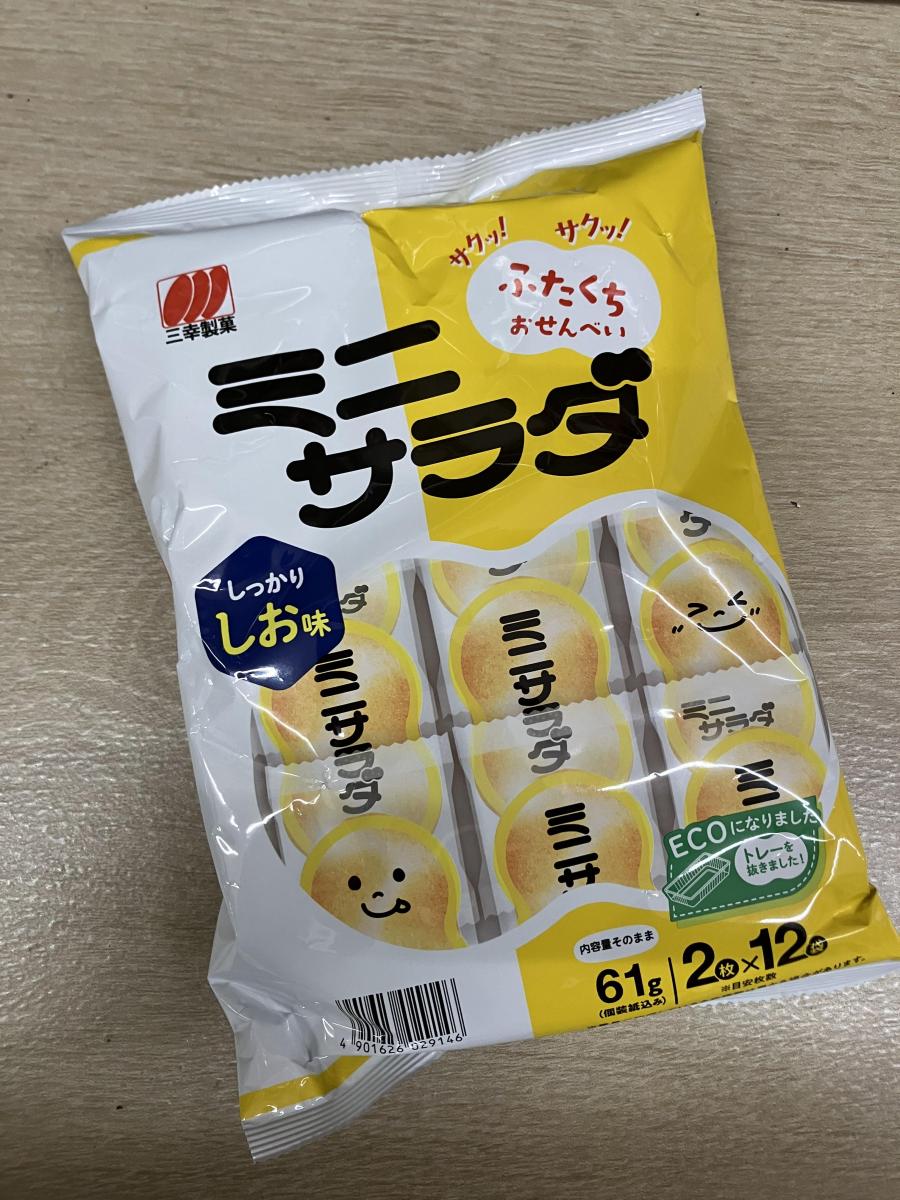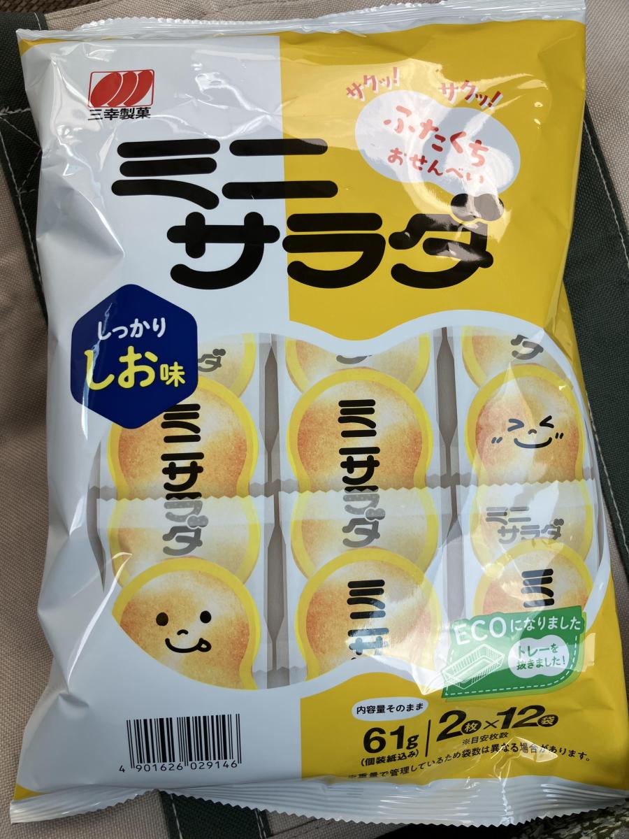 三幸製菓のミニサラダ スーパーでセールしていたので久しぶりに買って食べてみました。小さめの食べやすいお煎餅2枚が12袋、しっかりしお味は本当にしっかり塩がきいていて旨みもあり食べ出したら止まらないしお味でした。サクサクで食感もよく食べやすい形で美味しかったです。