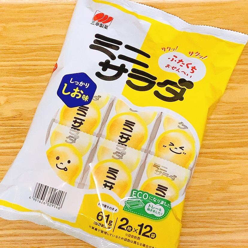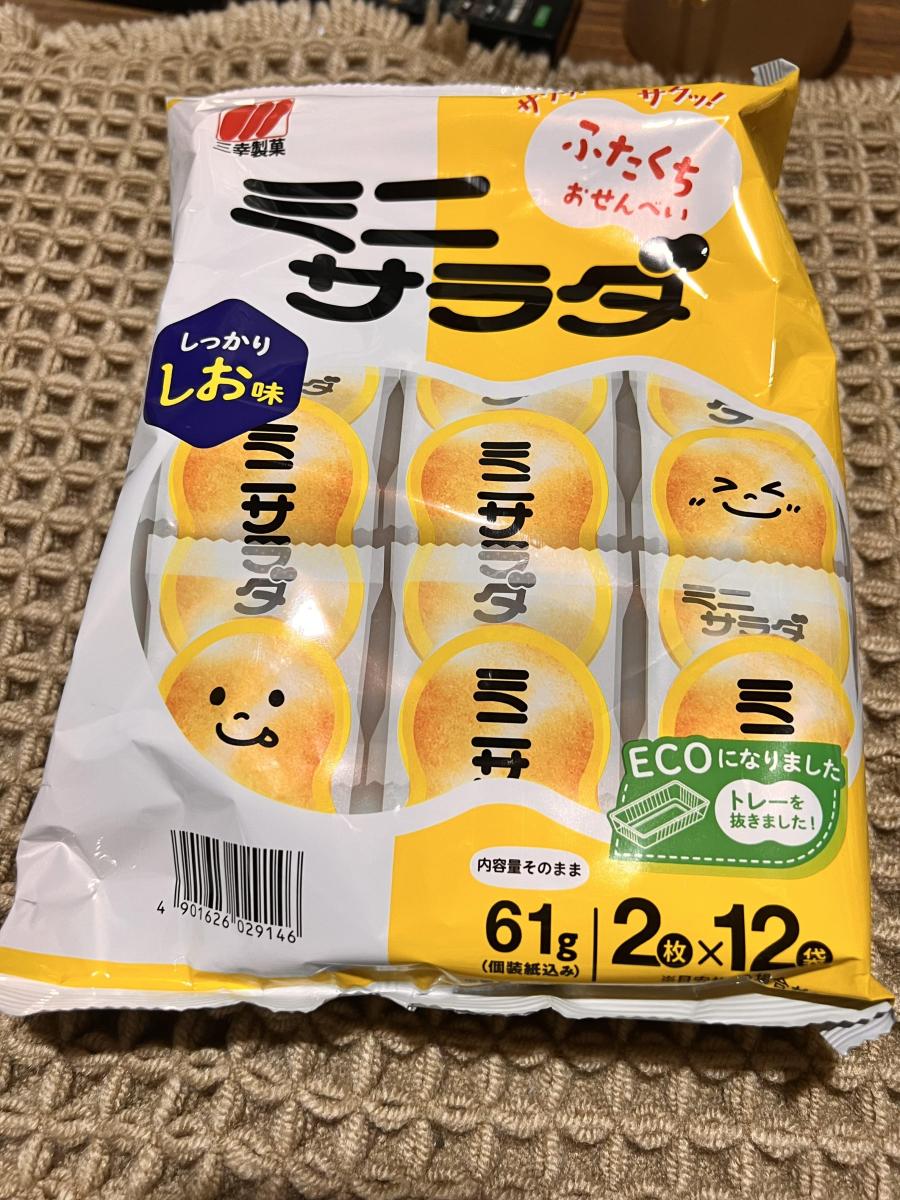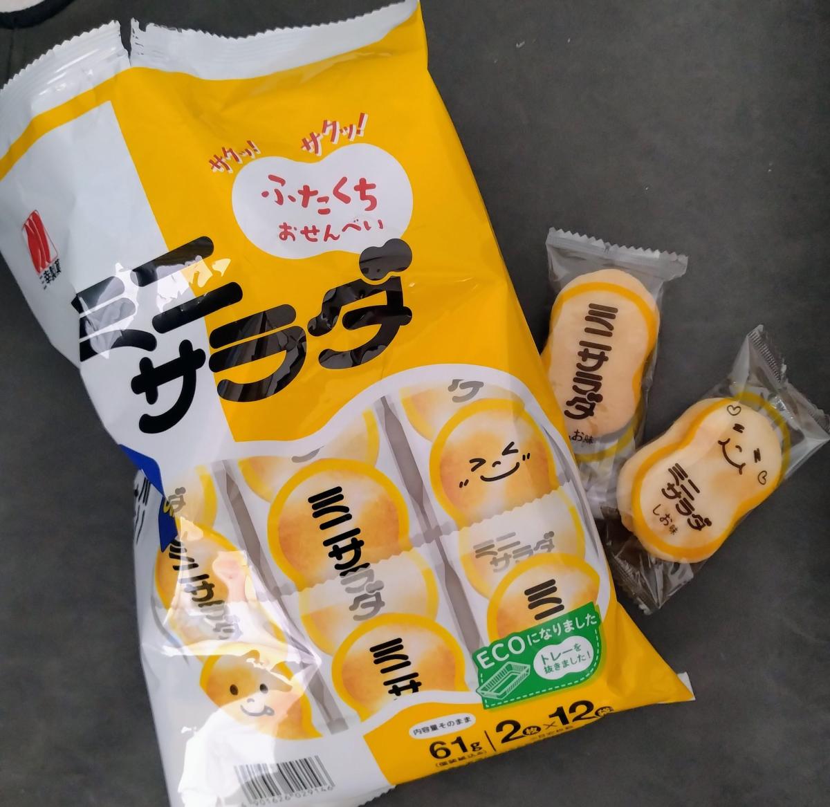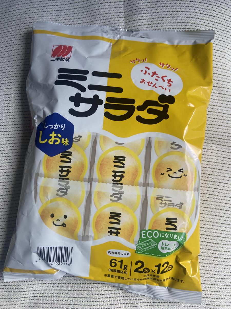 三幸製菓のミニサラダ スーパーでセールしていたので久しぶりに買って食べてみました。小さめの食べやすいお煎餅2枚が12袋、しっかりしお味は本当にしっかり塩がきいていて旨みもあり食べ出したら止まらないしお味でした。サクサクで食感もよく食べやすい形で美味しかったです。