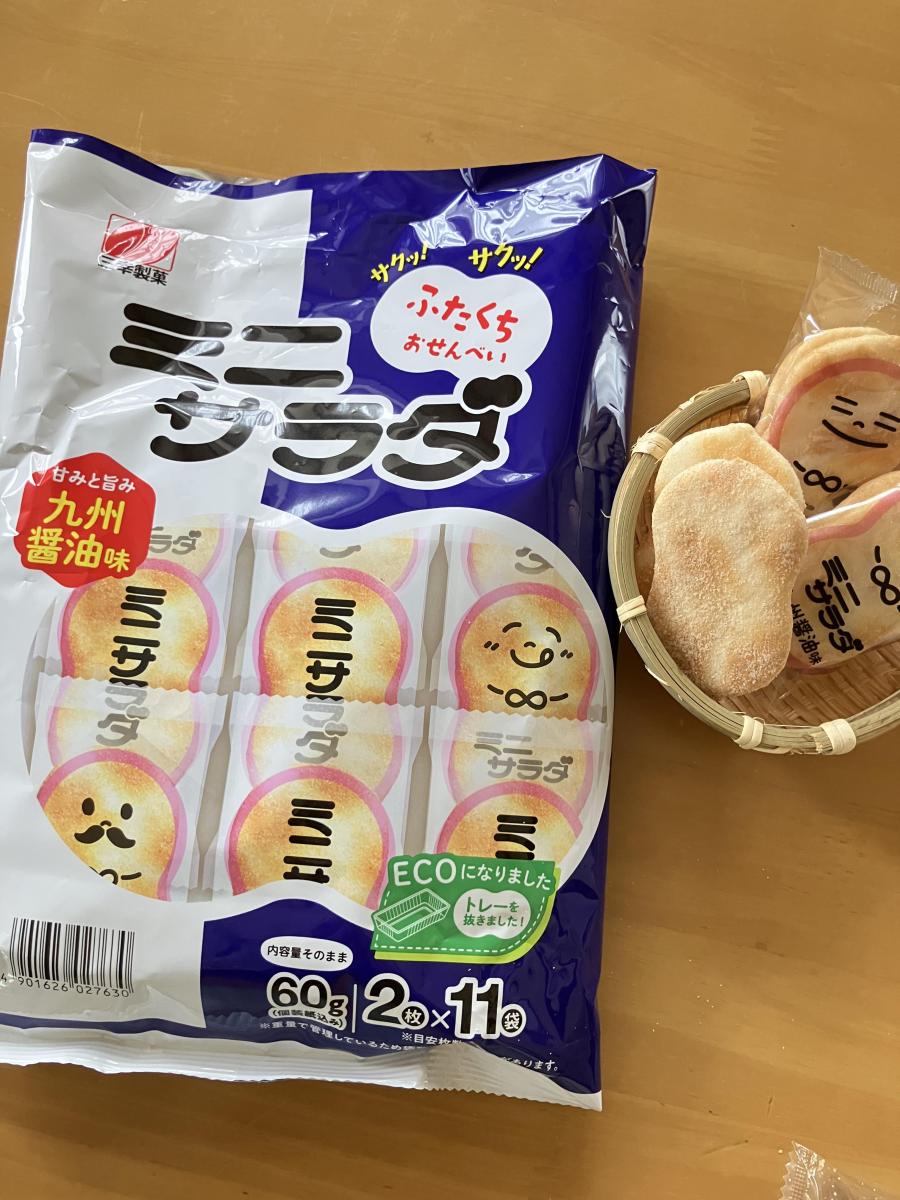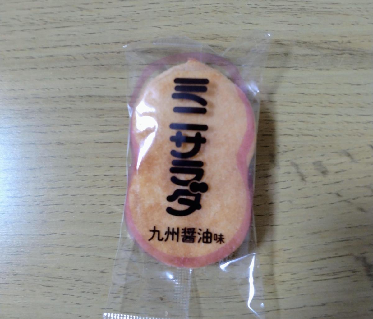 昔からあるミニサラダ。2個ずつ個包装になってて、なかには可愛いパッケージのもあります。甘い九州醤油味のこちらは、甘じょっぱくてサクサク食べれてやめられない美味しさ。お茶うけにもピッタリです。