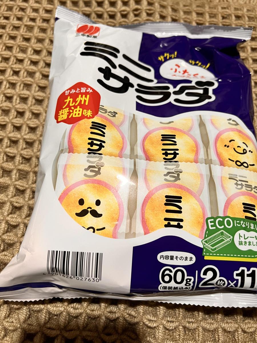 ミニサラダシリーズ、色々種類がありますが、定番の九州醤油味です。醤油、という感じだけでなく、甘くまろやかさもありこの味は個人的にとてもお気に入りで、リピートしています。食べやすいサイズ、おやつにぴったりです。