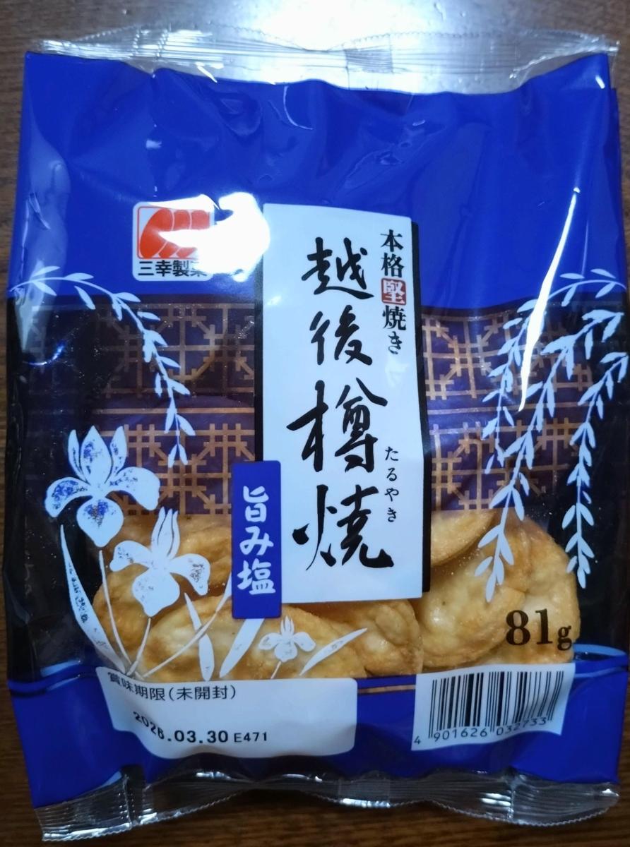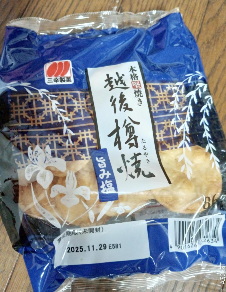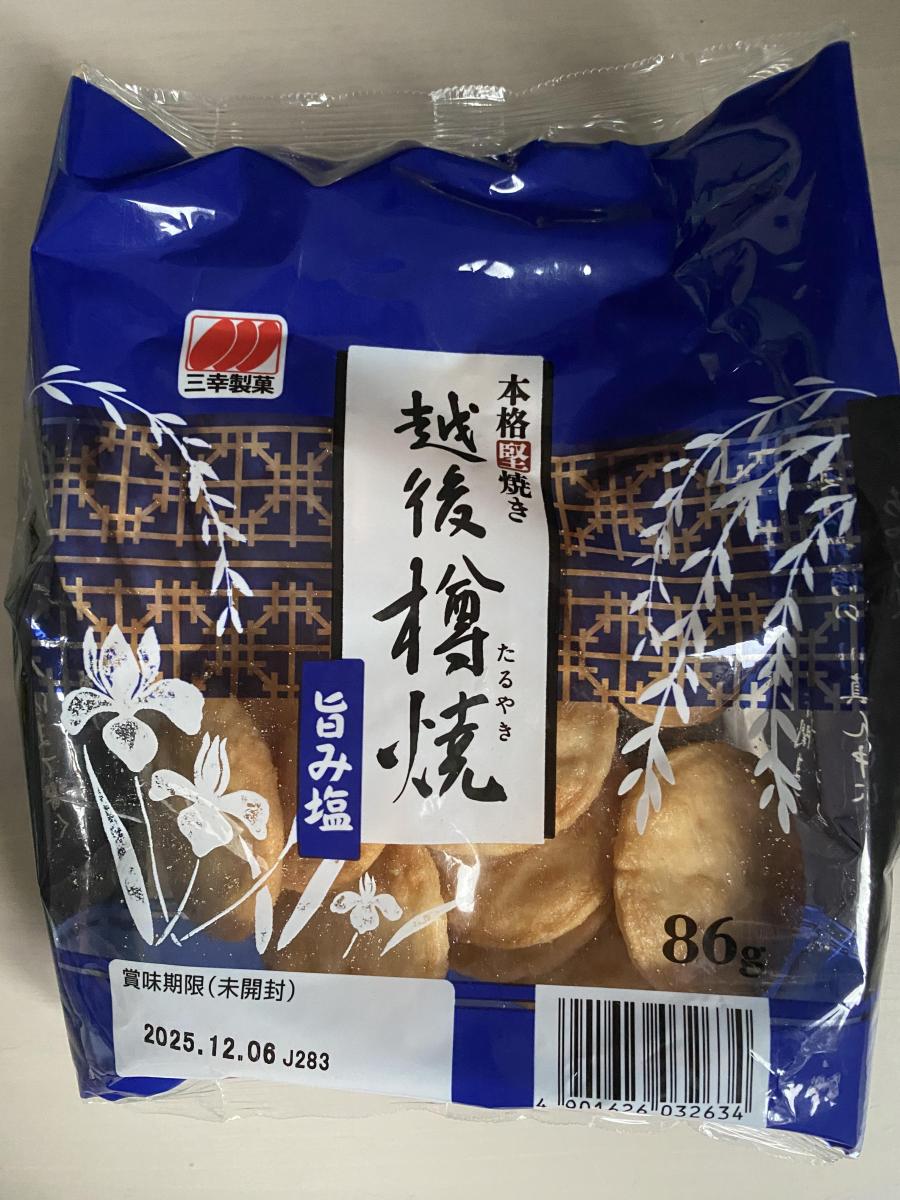 三幸製菓さんの『樽焼』はお手頃価格で美味しいので、よく購入しています。『しょうゆ』味も好きですが、こちらの『旨み塩』味もお気に入りです。