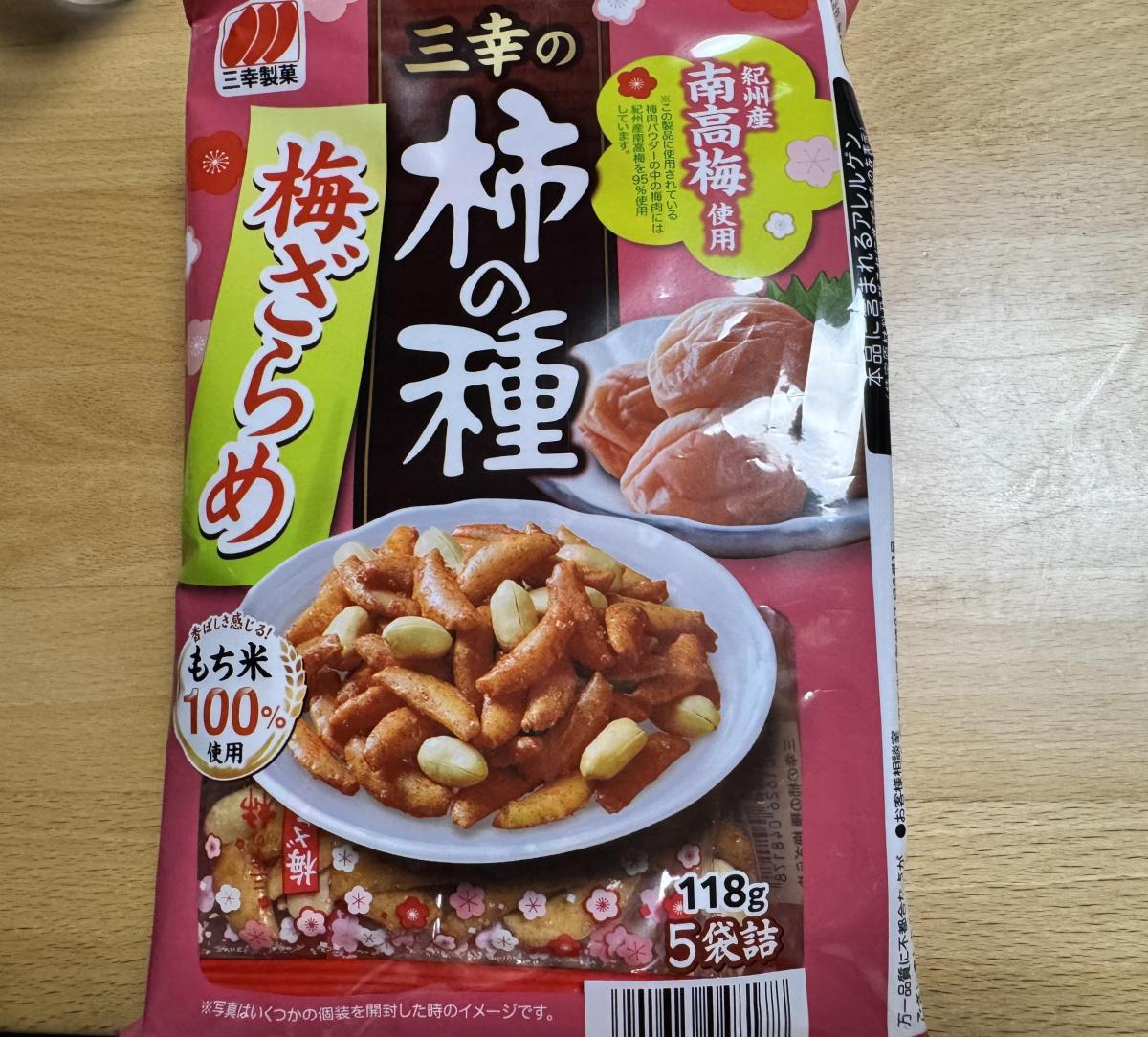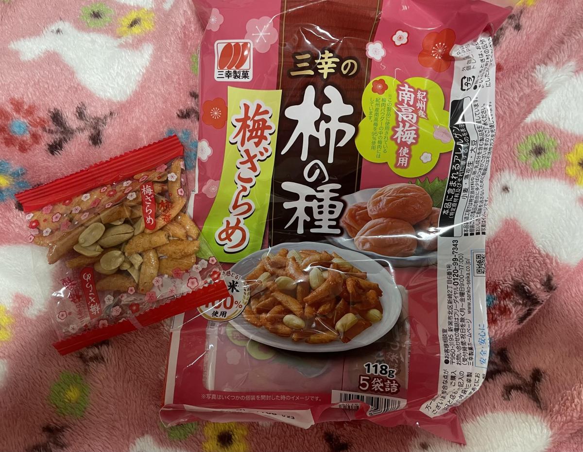 こちら、ざらめせんべいや、梅味がお好きな人に本当におすすめ!!の柿の種です。いつもの美味しい柿の種に、梅味のざらめがたっぷりついており、梅をちゃんと感じられて本当に美味しいです。ピーナッツとももてもよくあい、食べる手が止まらなくなる美味しさだと思います。個包装になっておりひとつの量もちょうどよいです。和風のお茶ともとてもよくあいました。また梅味食べたくなったら必ずリピートしたいです。