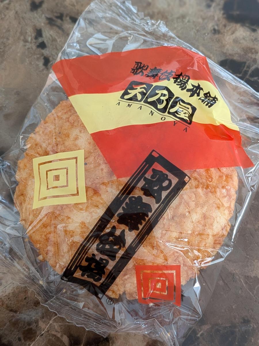 歌舞伎揚、、、東京のお菓子なんですね。他のメーカーのはよくありますが、天乃屋さんのはふだん見かけないです。たまたま売ってて、パッケージが派手で目立ってました、