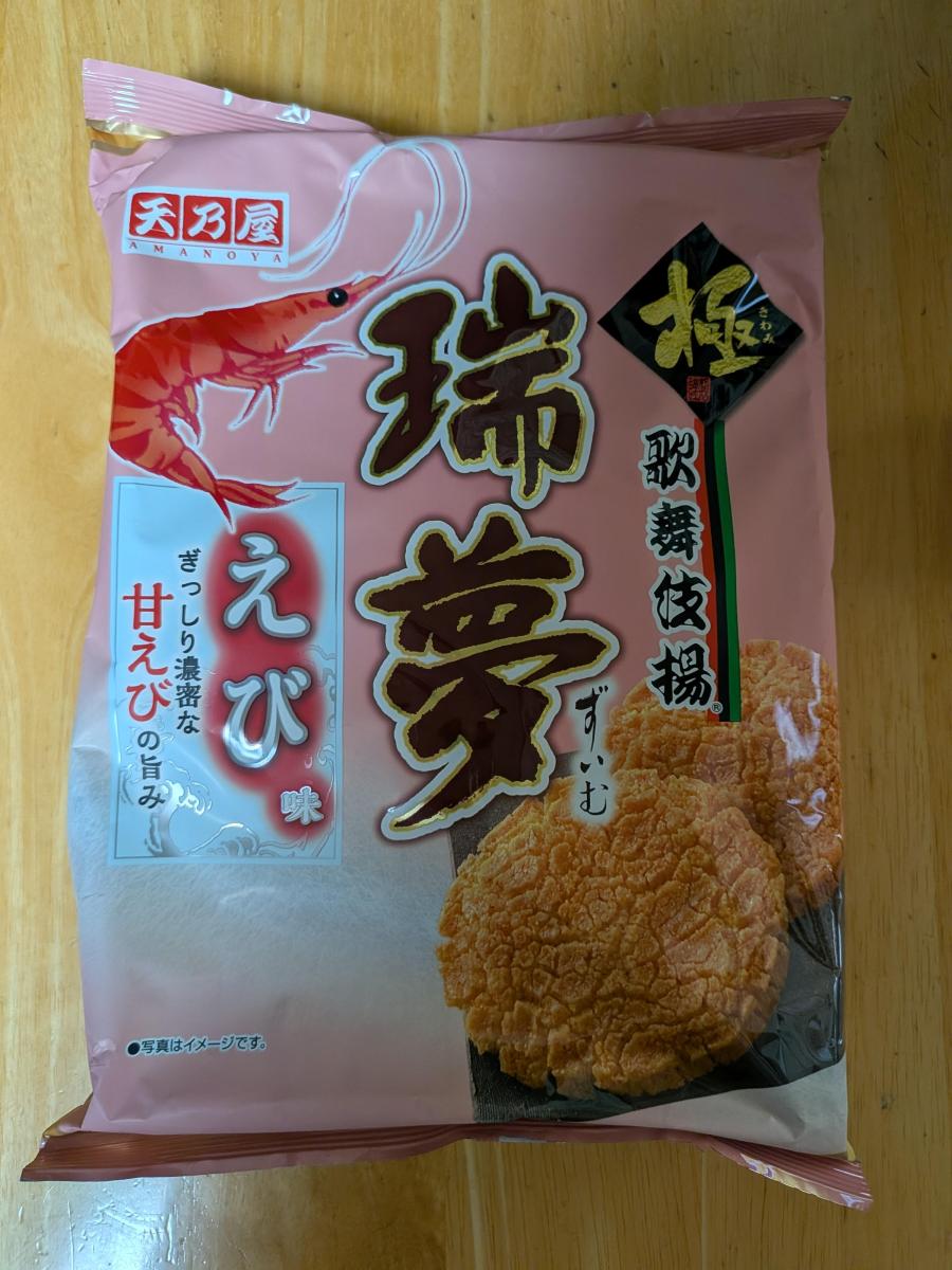 天乃屋の歌舞伎揚瑞夢えび味です。一枚1枚時間をかけて揚げているため、通常の歌舞伎揚よりソフトで口どけ滑らかな贅沢食感です。ちなみに、瑞夢とは縁起のよい夢とのことです。