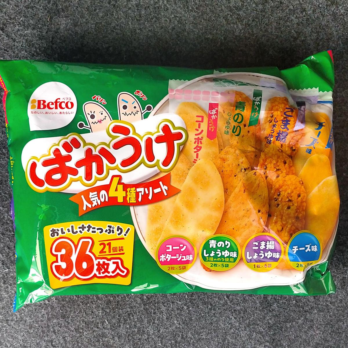 ばかうけアソート、この厳選4種の味は家族にも大好評で、ありがちな「この味だけ残っちゃう」ということがありません。どれも美味しく、ほんのり甘いポタージュやコクのあるチーズ、しょっぱいものが欲しいときには香ばしさのある胡麻揚げしょうゆと青のりしょうゆ、完璧な布陣ですね!