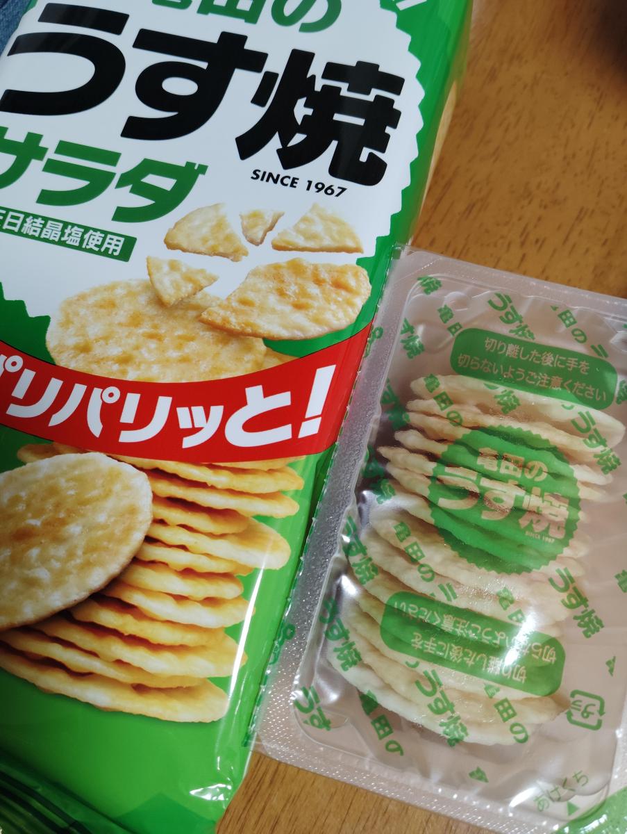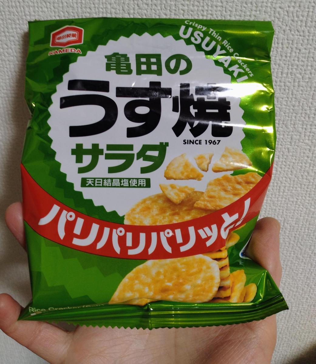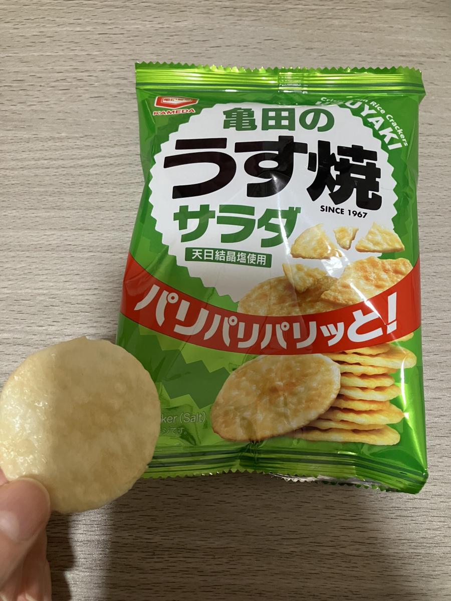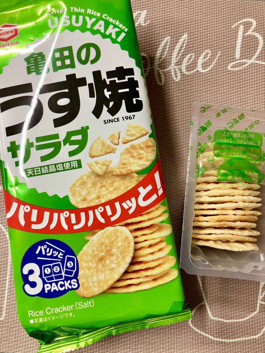 昔から見かけるうす焼きサラダ味、薄く、塩気のあるパリッとした食感のよいおせんべいです。パリパリした食感が好きでつい食べてしまいます。あっさりして食べやすくお米が原材料なので、あまり罪悪感なくおやつやおつまみにも食べられるのが良いです。