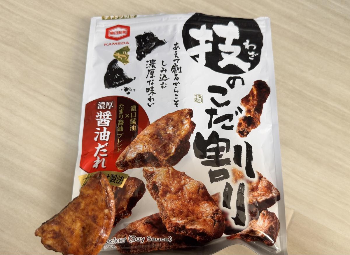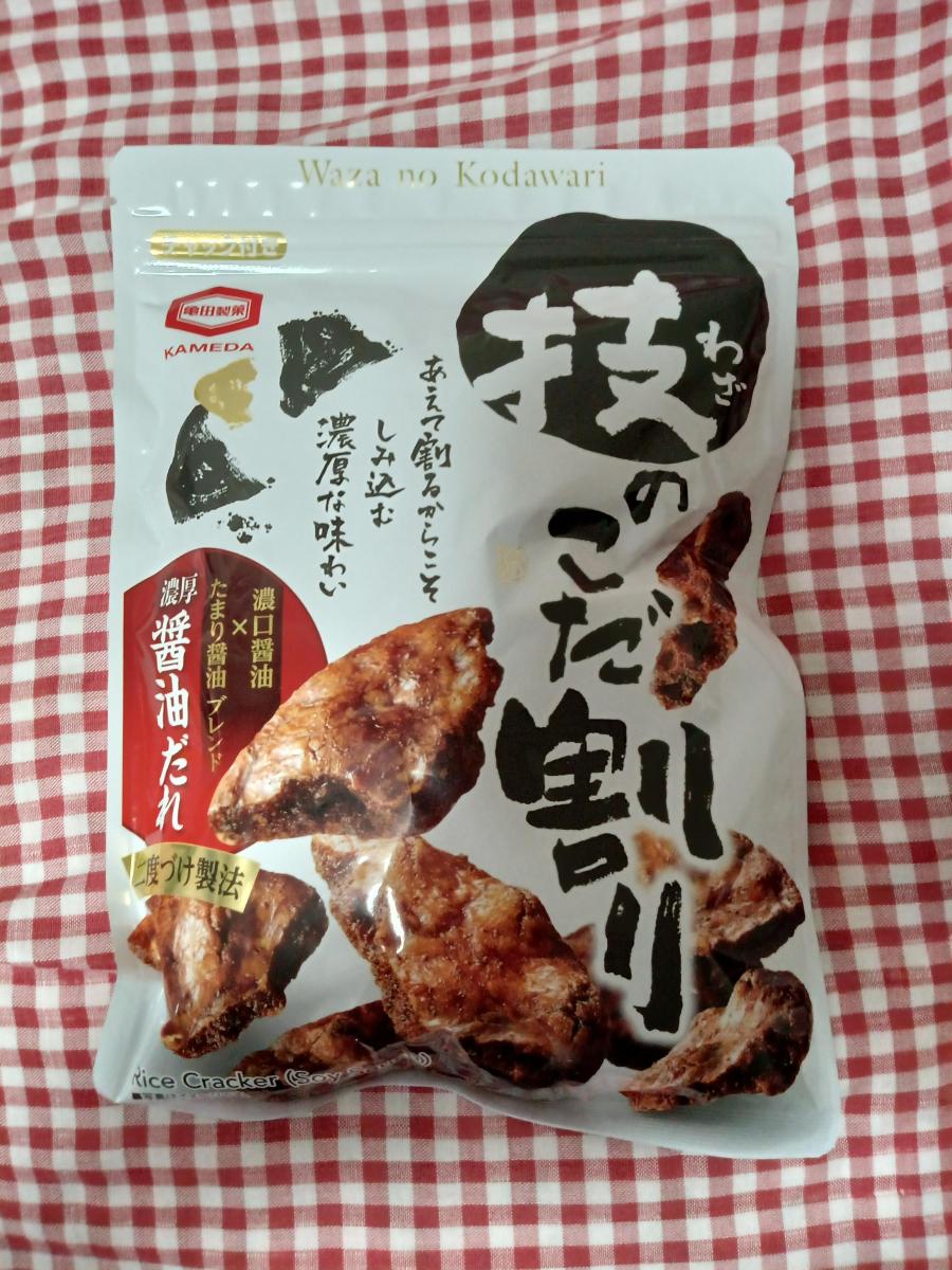技のこだ割り 濃厚醤油のネーミングに惹かれてどんな味か試したく購入してみました。ゴツゴツとした割れせんべいです。バリバリと堅めの食感で噛み応えがあるので、食べ応えがあります。二度漬け製法のためしっかりと醤油が染み込んであるので、ガツンと濃い醬油味ですが、甘しょっぱさがなんだかやみつきになる味わいでクセになります。また購入してみたいなと思いました。