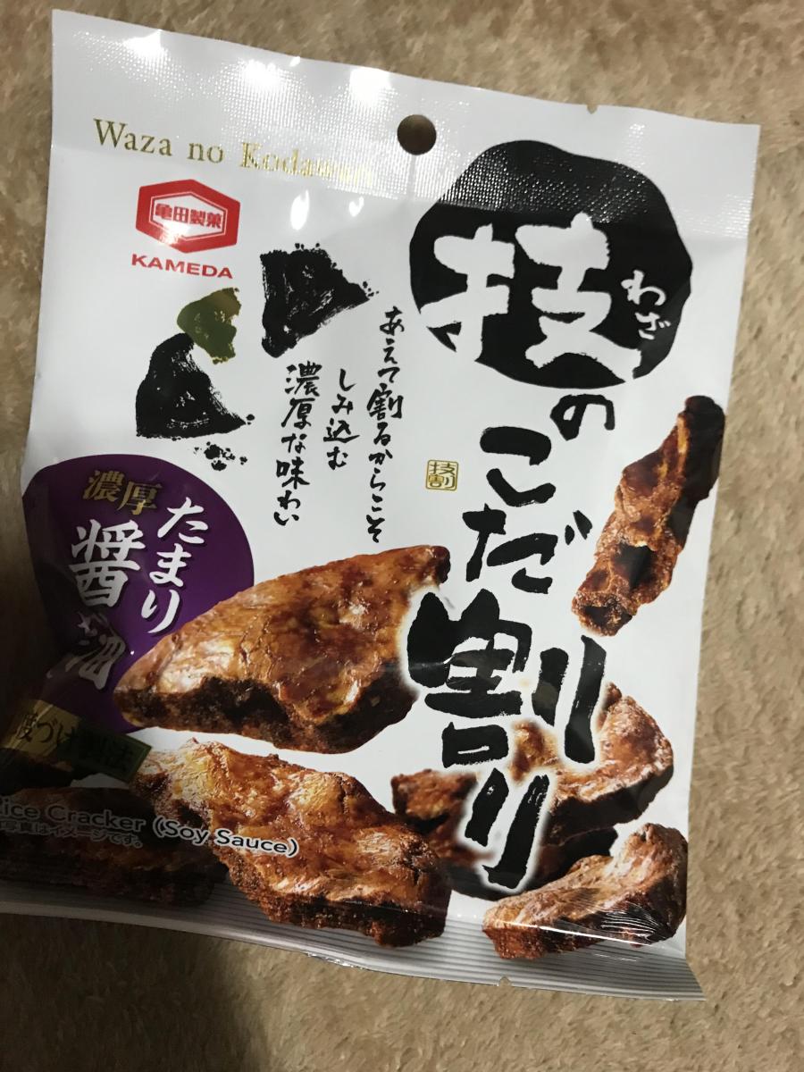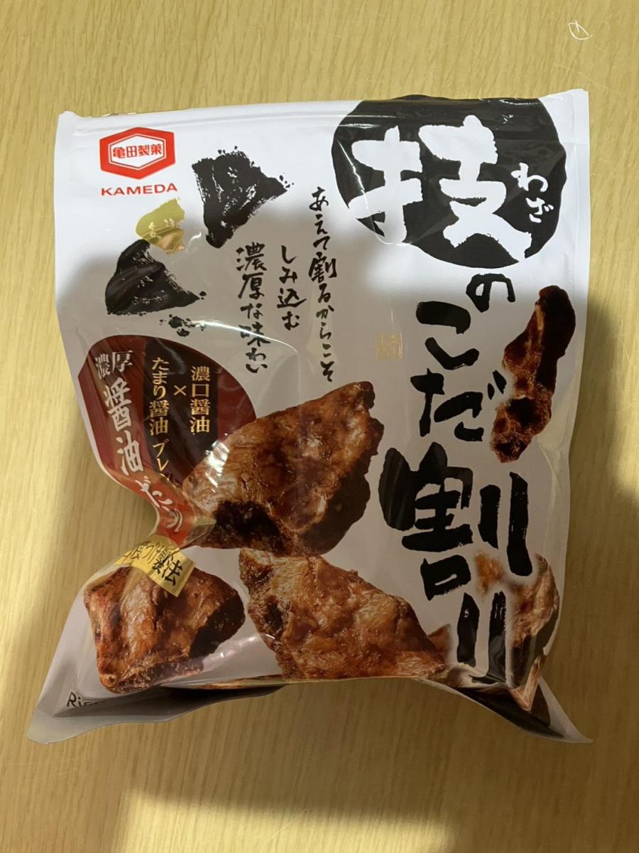 技のこだ割り たまり醤油味と美味しそうなネーミングに惹かれて購入してみました。深みのある醤油せんべいの食感はパリッと堅めでハードな食感ですが病みつきになる食感です。色味の通りしょうゆは濃いけどしょっぱすぎない甘みも病みつきポイントで大変美味しかったです。また買いたいなと思いました。