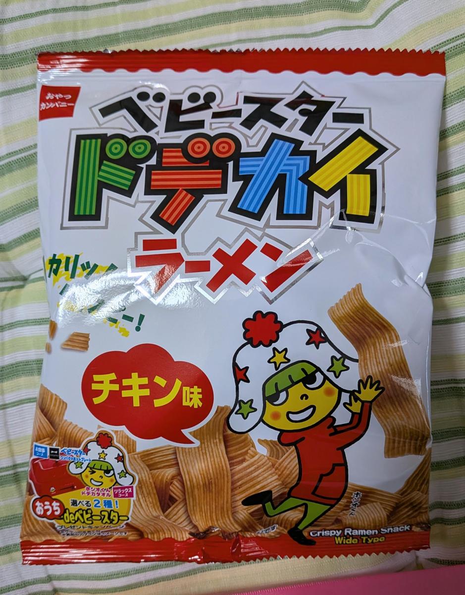 最初はベビースターといえば細くてパラパラしてるもの!という固い考えがあったので、なかなか受け入れられなかったのですが、いざ食べてみると細いものよりしっかりチキン味を感じられる上、なんと言っても食べやすい!!大きい分満足感もあり、我が家では子どもも私も大好きなお菓子のうちの一つです!