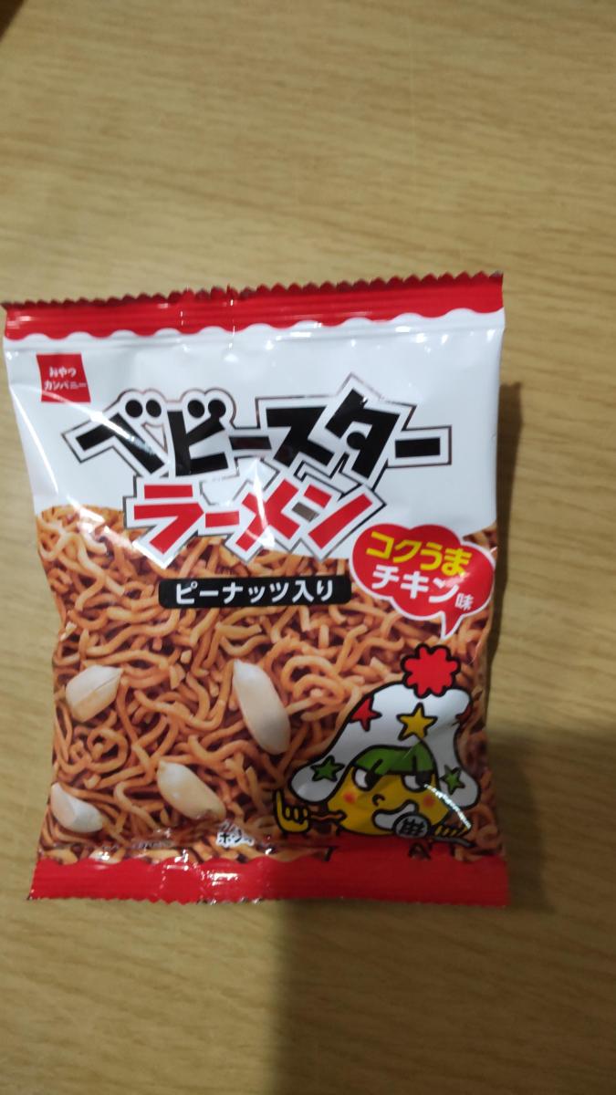 シンプルなチキン味のベビースターラーメンをベースにした商品です。ベビースターラーメンのチキン味とピーナッツの