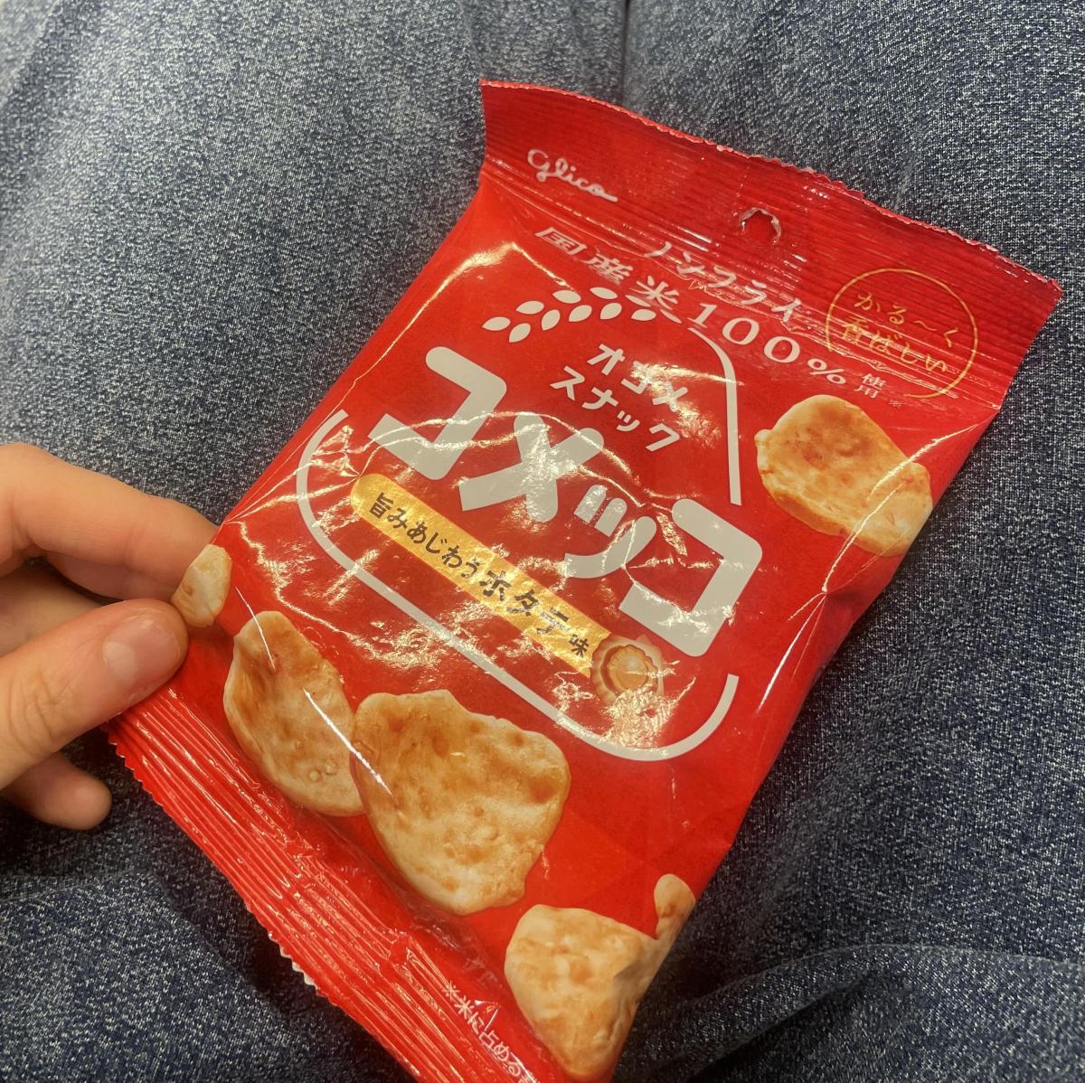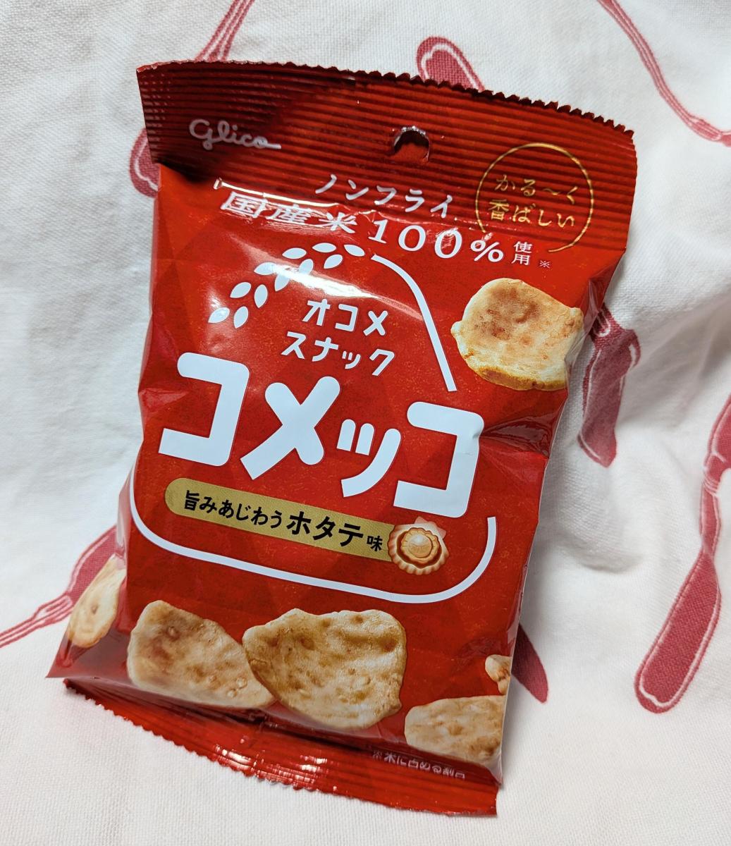 可愛らしい大きさのおコメのスナック、コメッコが並んでいました。赤いパッケージは、旨みあじわうホタテ味だそうです。