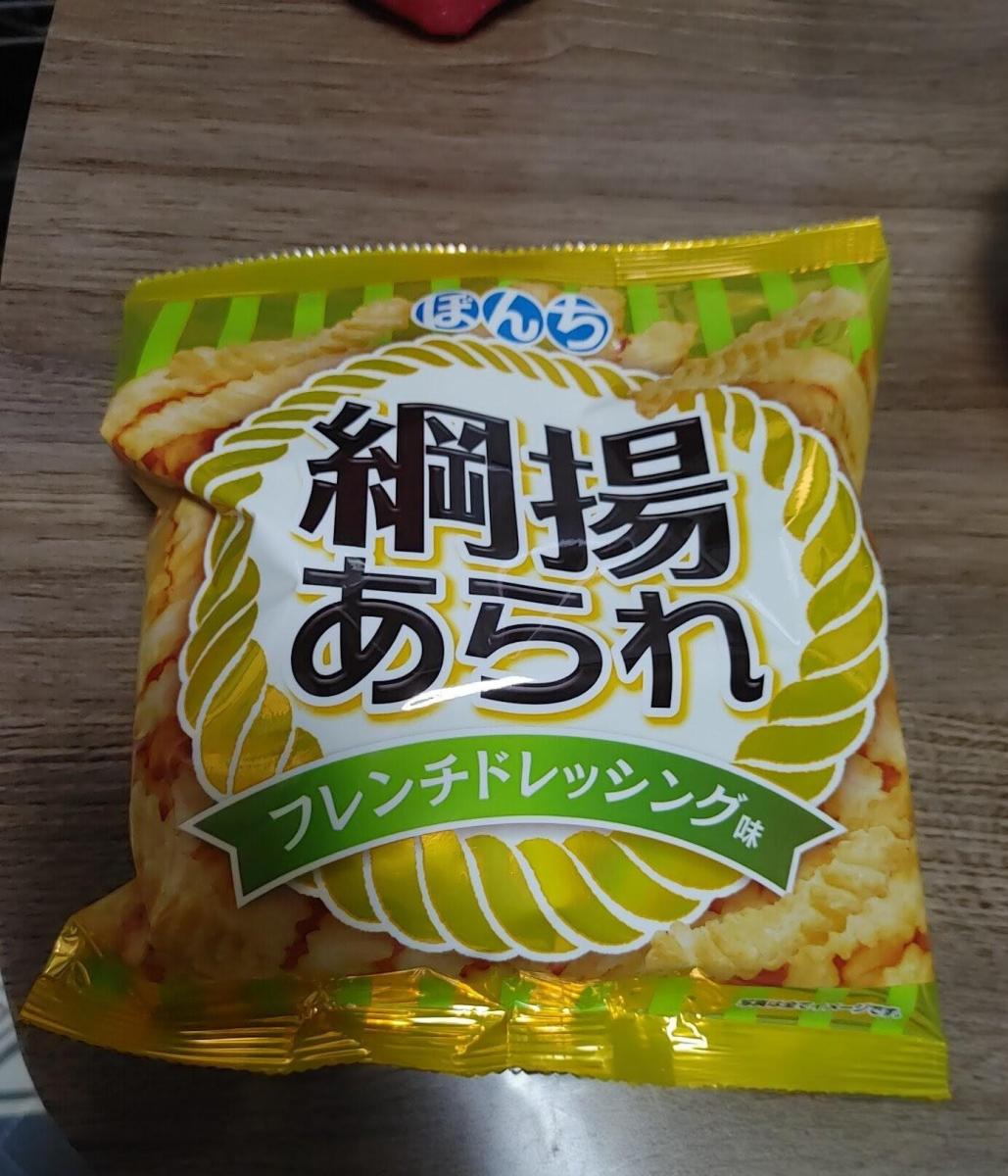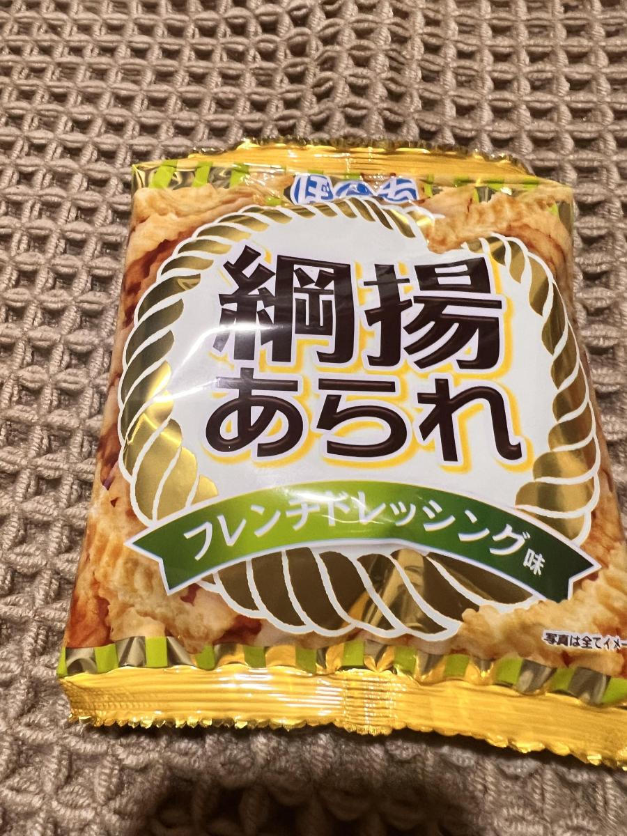 綱揚あられでフレンチドレッシング味というのが珍しくて興味をもちました。カリカリサクサクで塩味がしっかりしていて美味しいですがフレンチドレッシングはちょっとわからないですね。普通に塩味で美味しいと思って食べました。