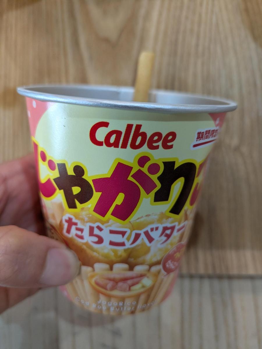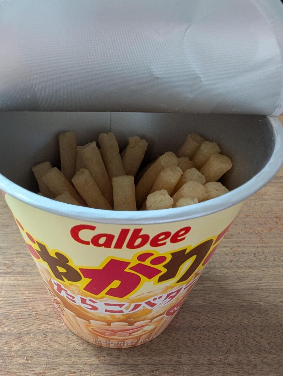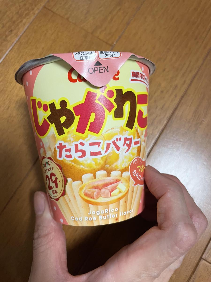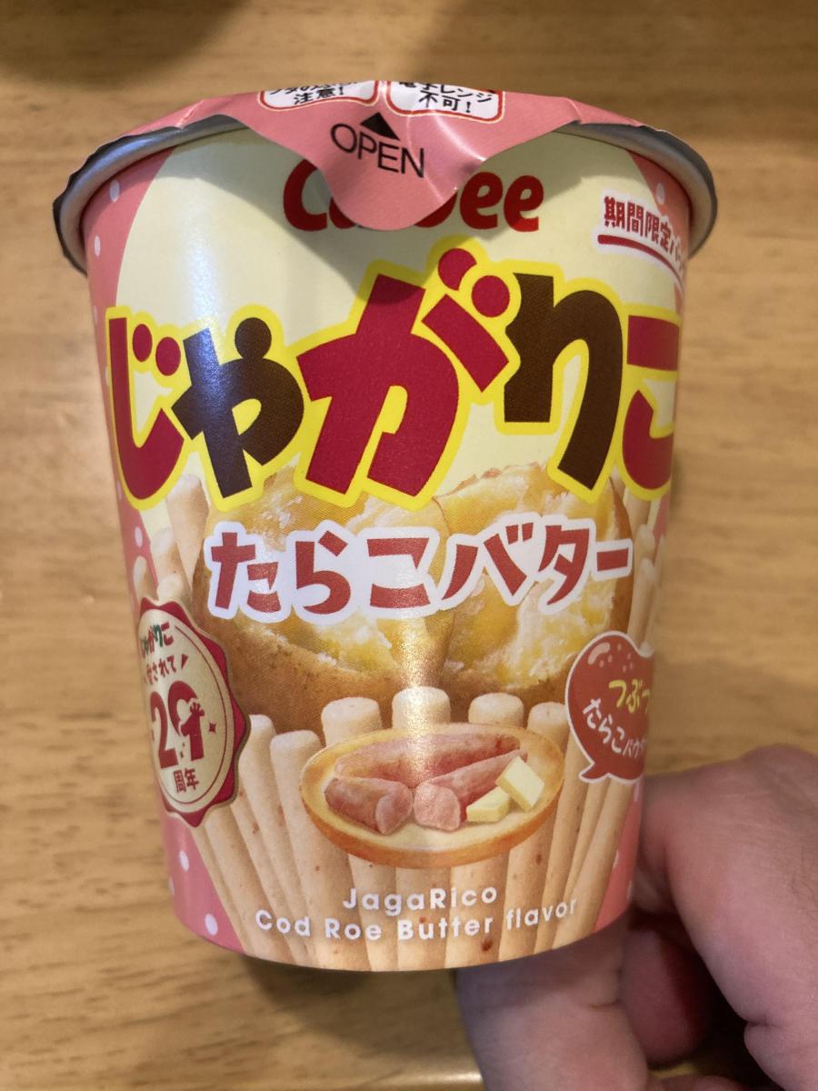 カリカリの硬い食感が心地よいじゃがりこ。こちらのフレーバーはたらこバターです。まろやかなバターの風味とたらこ味がポテトによく合いますね。