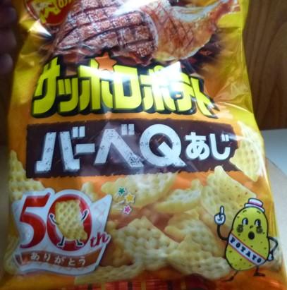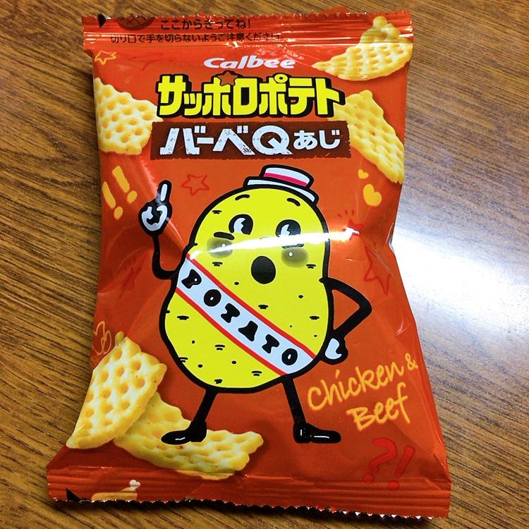 サッポロポテトのノーマルなバーベキュー味、あみあみの平べったいサッポロポテトのスナックに、少しスパイシーなバーベキューソースを思わせる味わいです。あまり濃すぎないので食べやすく、ポテトの味もしっかりしました。