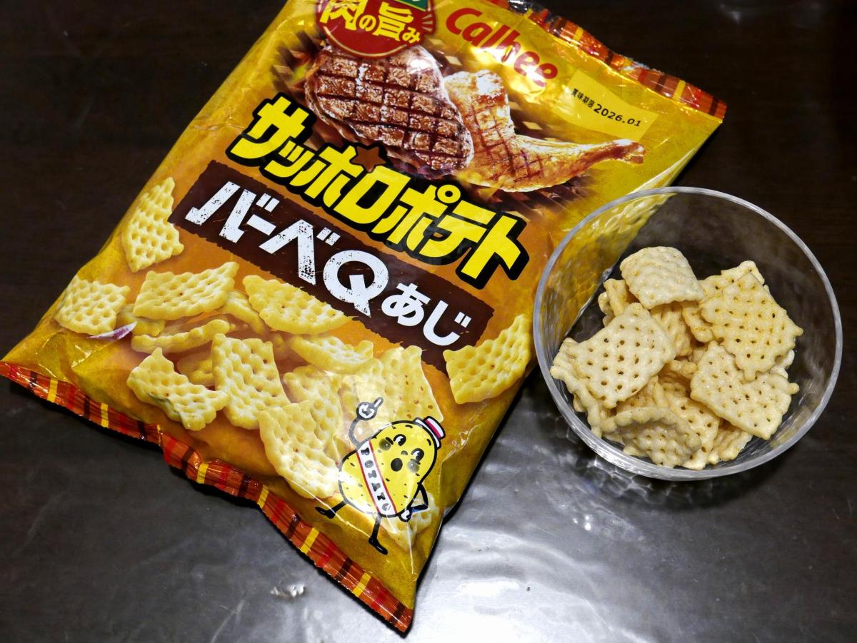サッポロポテトのノーマルなバーベキュー味、あみあみの平べったいサッポロポテトのスナックに、少しスパイシーなバーベキューソースを思わせる味わいです。あまり濃すぎないので食べやすく、ポテトの味もしっかりしました。