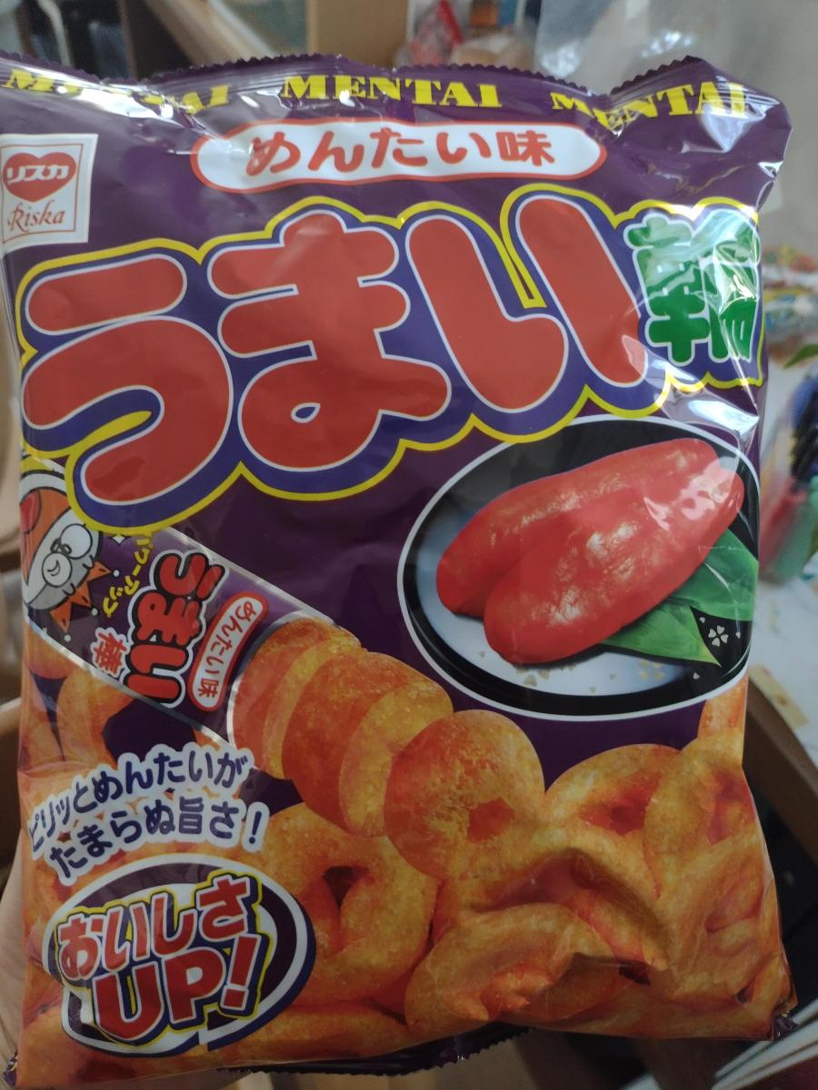 うまい棒が輪っかになった「うまい輪」さくさくでぴりっとした、めんたい味がまさに、うまいわ!しかもうまい棒何本分?たくさん食べれてうれしいわ!なんかお得感がありました。