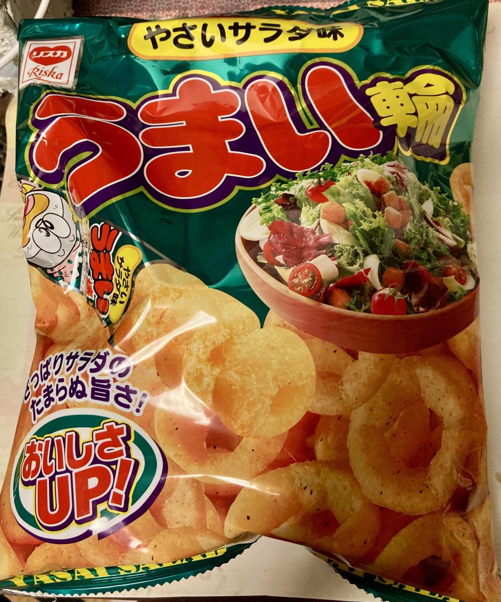 うまい棒が輪切りになったとしか言いようがない、うまい輪。味は安定のうまい棒です。でもうまい棒より食べやすくて良いかな?いや、あれは棒だからこそ良いのか?どちらにせよ、味は間違いなしです。うまい棒より量が多いからちょっと飽きるかも。