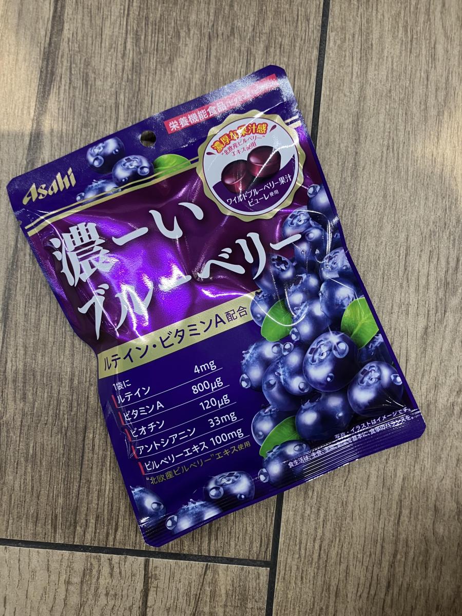 アサヒさんの濃ーいシリーズのキャンディは他の味も美味しくて好きですが、パッと目を引くブルーベリーの色と一袋にビタミンAやビオチンなど栄養機能食品もとれて、濃い果汁感はあるけれど濃すぎずなめやすく、甘すぎず爽やかさもあるキャンディです。なめていると元気になれそうな気がします。