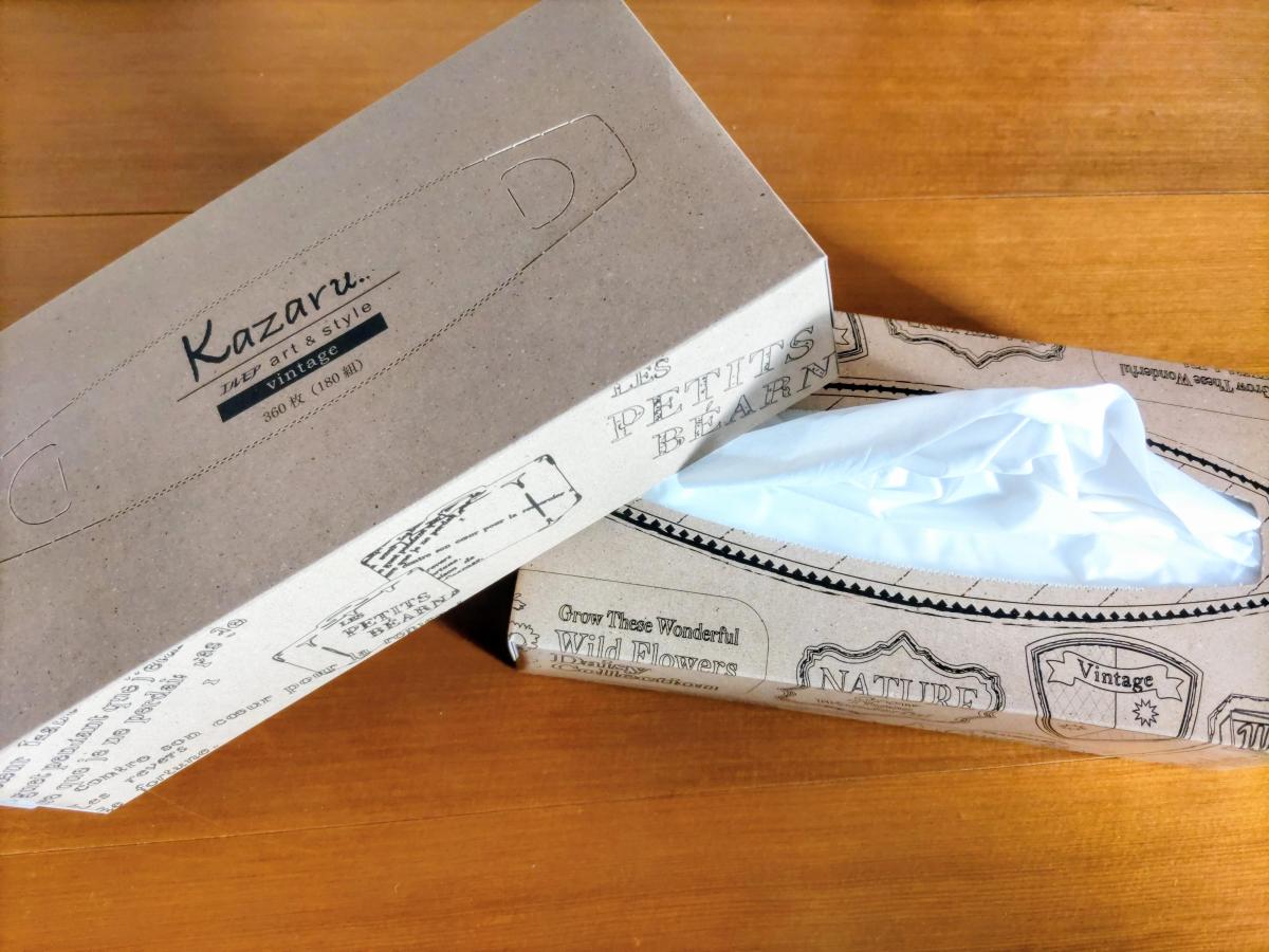 おしゃれな箱のティッシュです。自然な感じなのがいいのと、インテリアみたいに家具に溶け込むのがいいですね。ティッシュは使い心地抜群で使いやすいです。