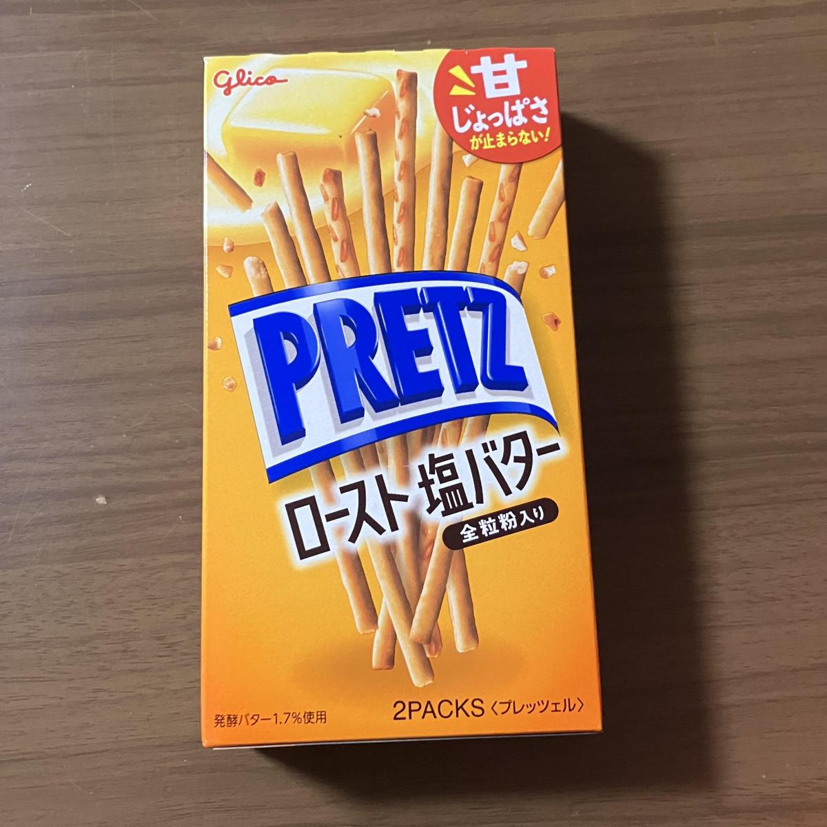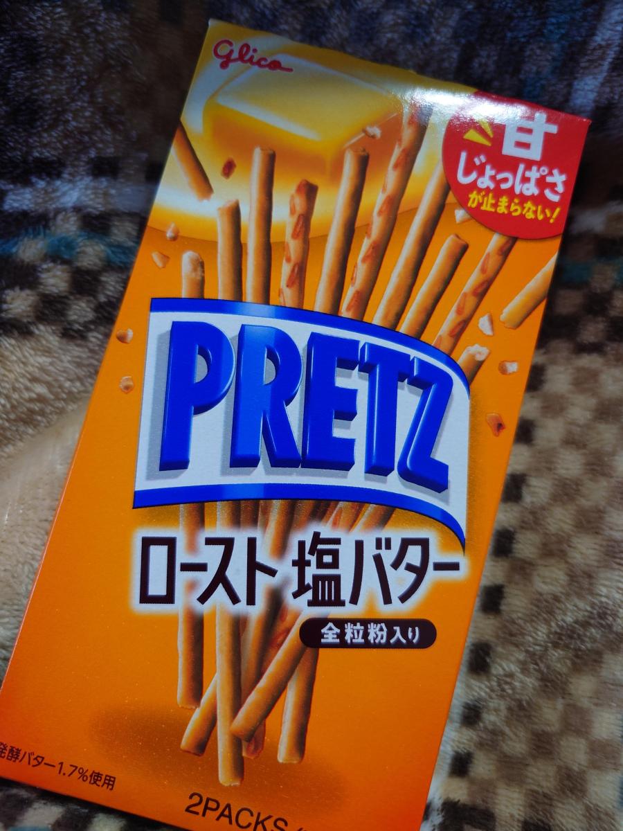 プリッツのロースト塩バター味です。バターと塩の甘じょっぱい味わいがとても美味しいです。全粒粉入りのクリスピーな食感がとても美味しいです。