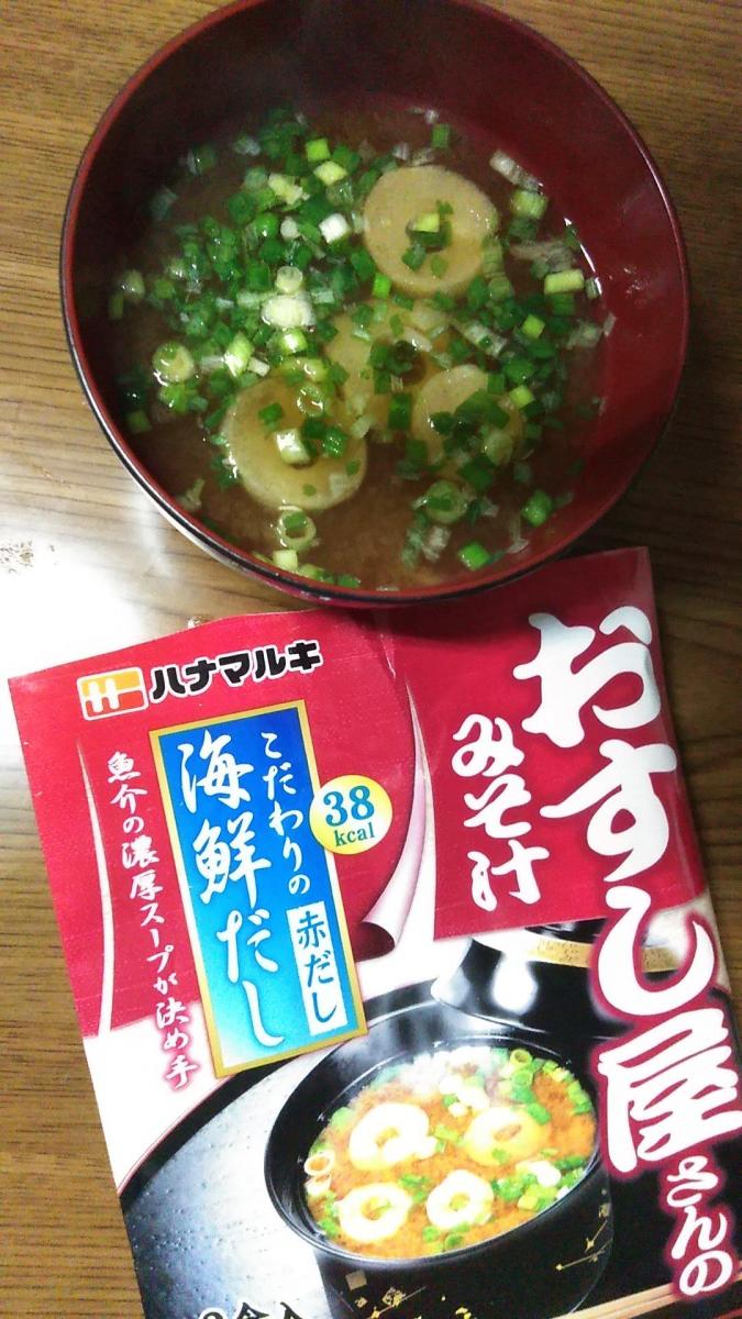 パッケージの文字をよく見てなくて、赤だしのお味噌汁だったことにビックリ!ネギと大きめな麩がたくさん具材として入ってたのでそのままいただきました。すっごく濃厚な赤だしでした。お湯を多めに注がないとお味噌が溶けきれないほど。お寿司とかと組み合わせると合うと思います。