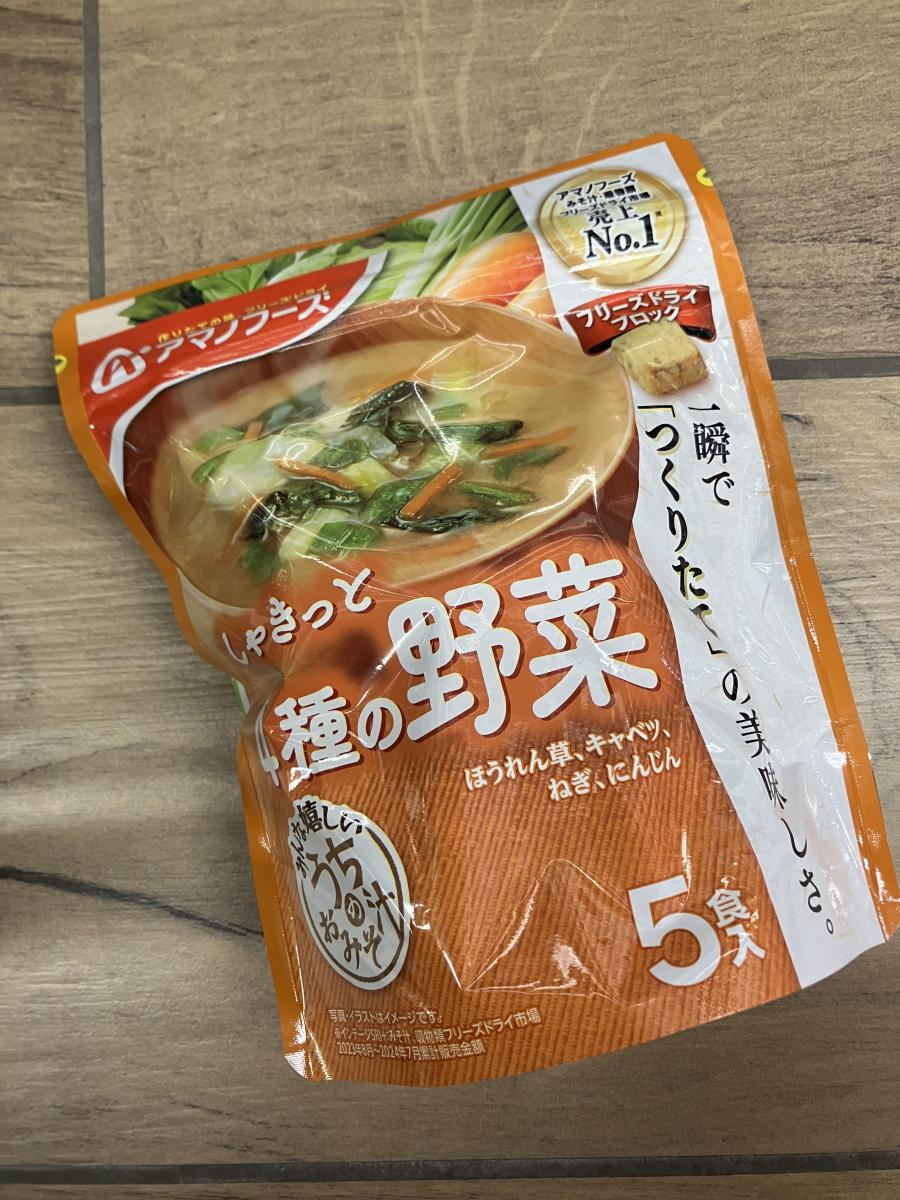 野菜がたくさん入っていて、お味噌もしっかり出汁の味がして美味しいです。ただ、個人的には同じアマノフーズのフリーズドライ味噌汁なら、なめこや茄子のものの方が具の味がしっかりしていて好みです。それでも手軽に具沢山のお味噌汁がいただけるのはありがたいです。