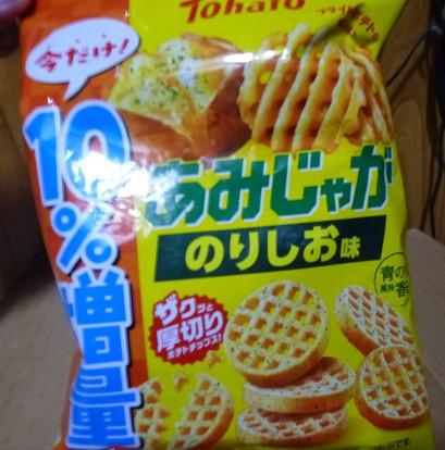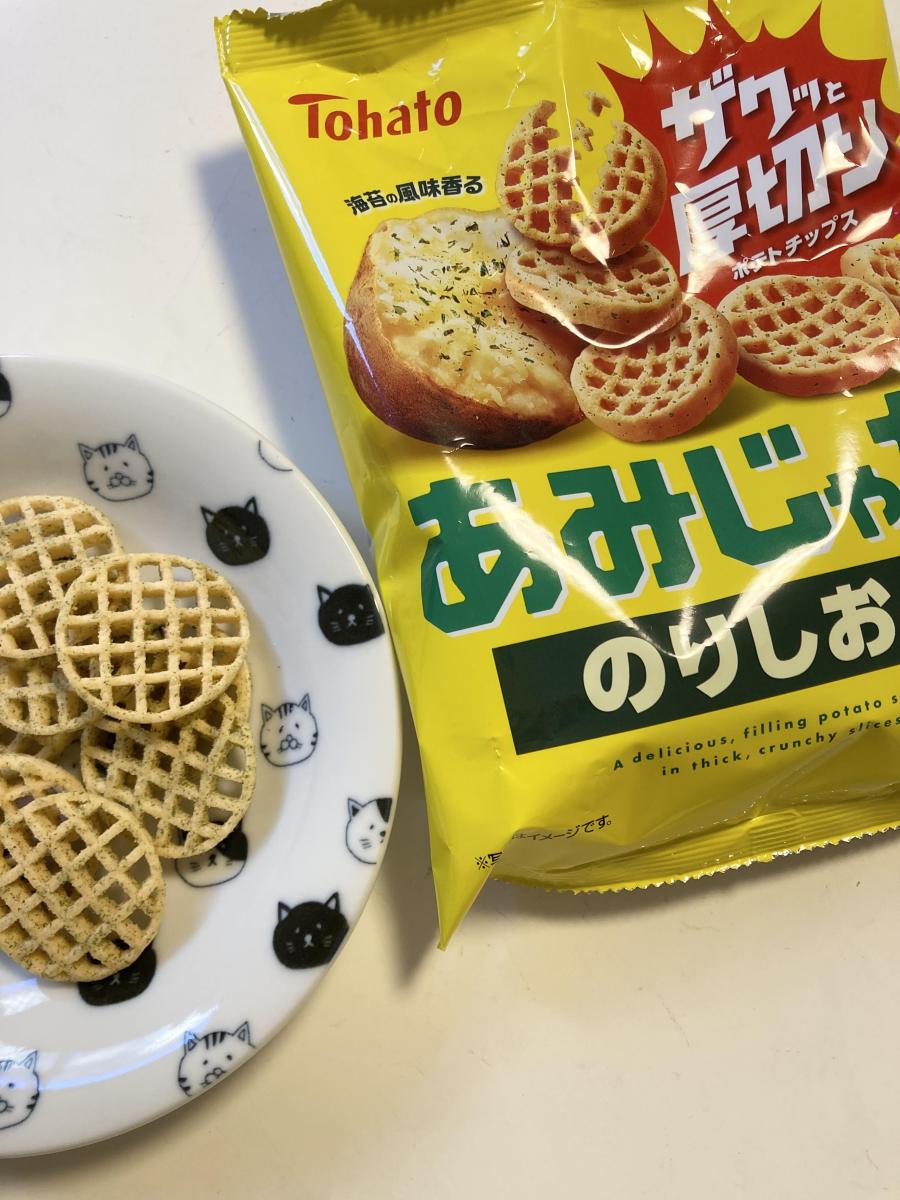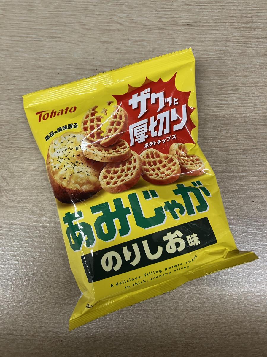 あみじゃがは厚切りで網目状の見た目が美味しそうだし、ザクザクと歯ごたえのある食感も好きです。のり塩味もパッケージが美味しそうで手に取りました。が、ちょっと塩味が強めな気がしました。もう少し塩味控えめな方がいいかなと思いました。