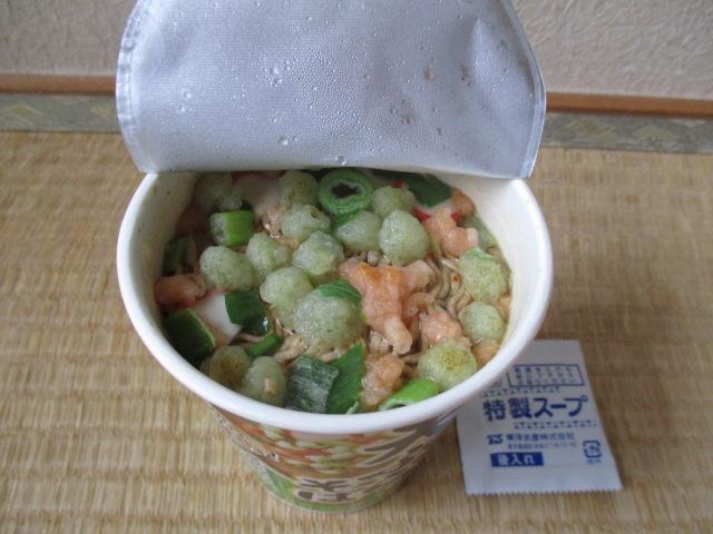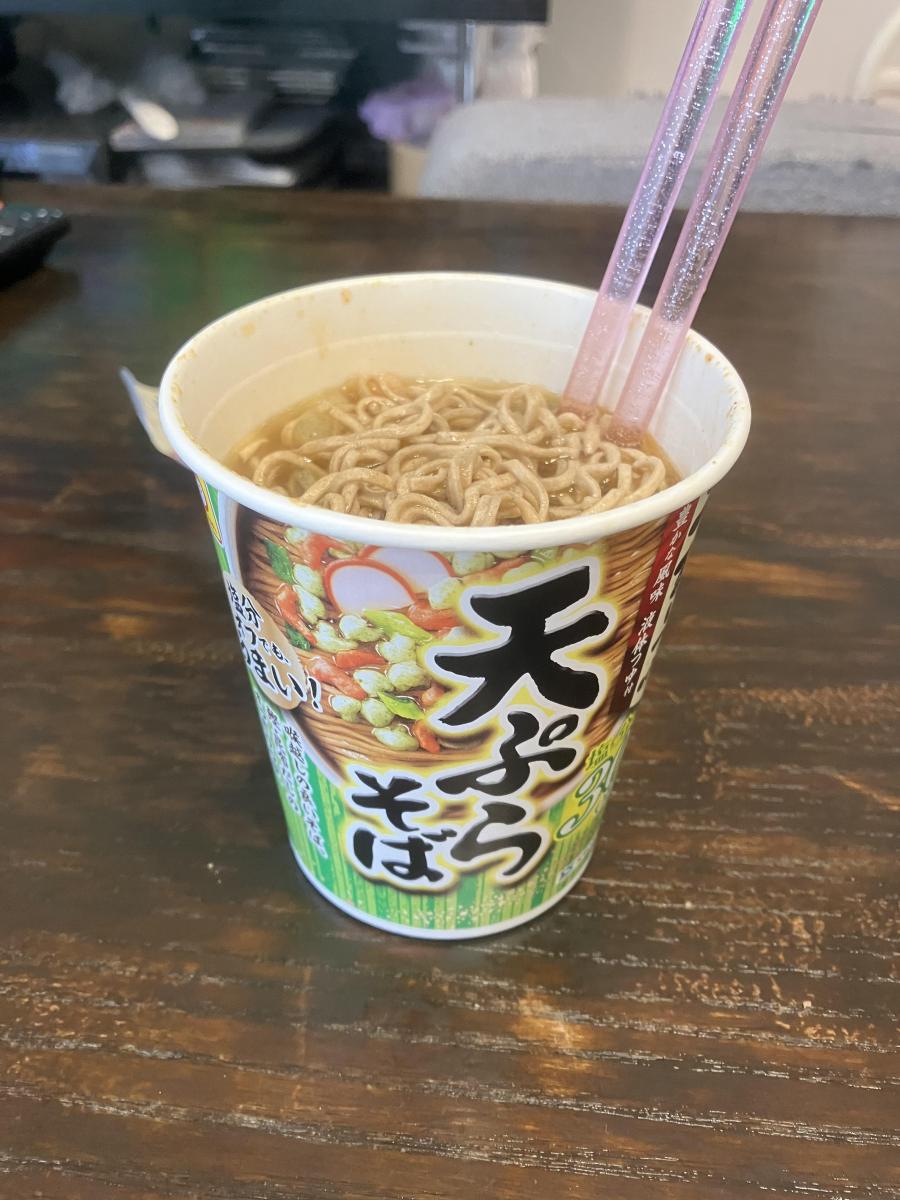 ちょっと味が薄い……と思ったら後入れの特製スープを入れるのを忘れてました。麺は可もなく不可もなく普通な印象。具は小えび天ぷら・かまぼこ・ねぎ等でエビが香ばしくて良かったです。次は湯を少なめにして味を見つつ、特製スープも入れて食べてみようと思います。