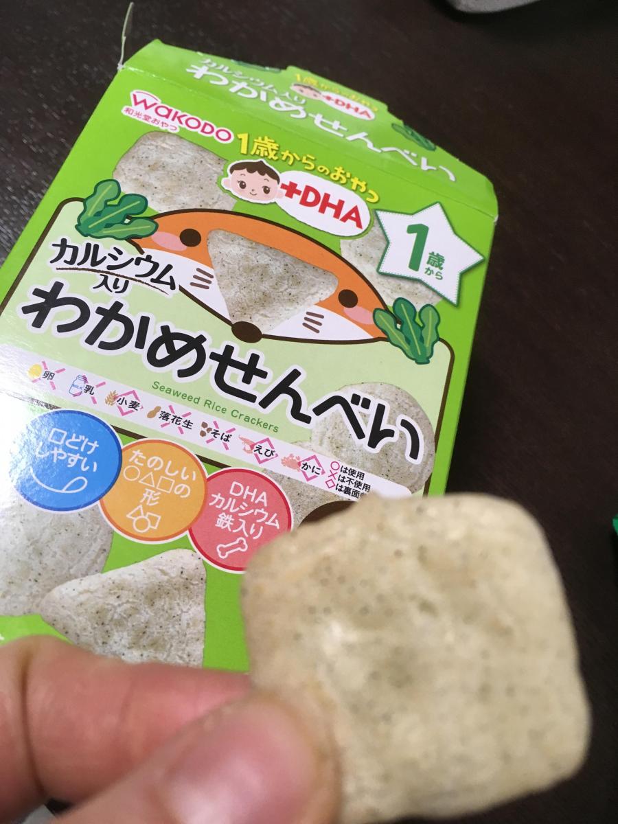 とっても細かくしたわかめが生地に混ぜ込まれたおせんべいでした。ほんのり塩味があり、子供もパクパクと食べてくれました。