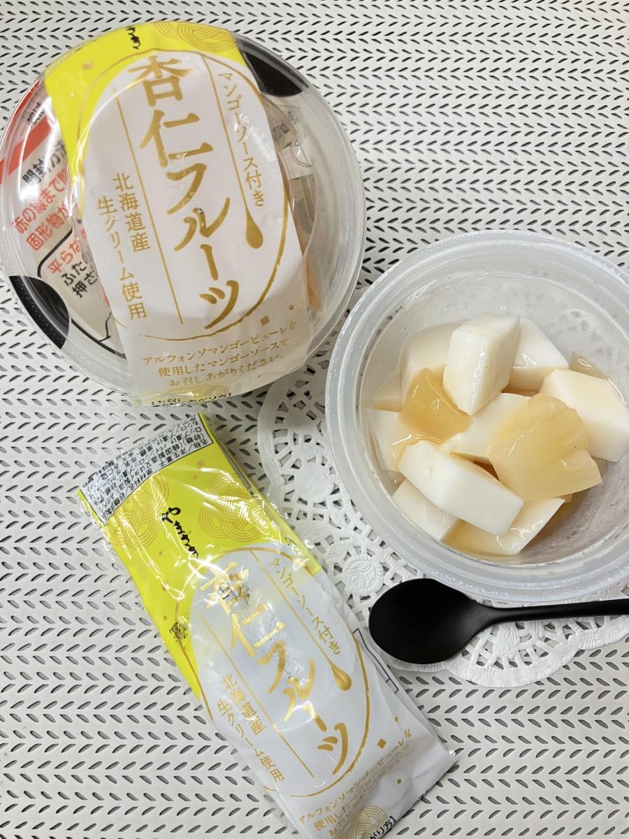 杏仁は甘めで杏仁特有の華やかな香りは控えめなやさしいミルク寒天のような味わい。食感はつるんとなめらかでやわらかめ。パイン、みかん、黄桃の果肉はそれぞれ食感と酸味の違いがあって、特にパインのシャキッと感がアクセントに。さらに付属のマンゴーソースのとろっとした甘さが全体に合わさって最後まで飽きないおいしさ。