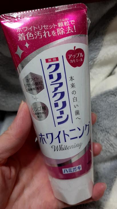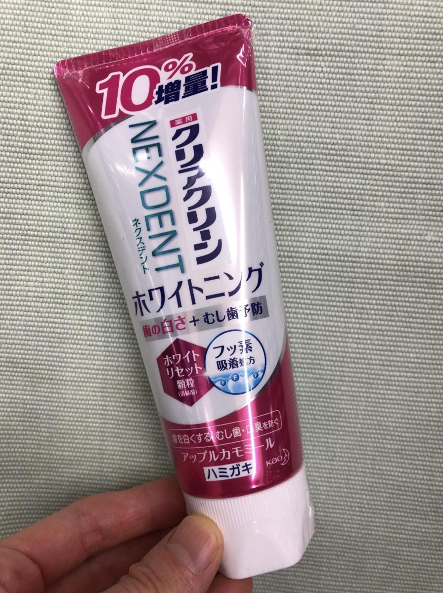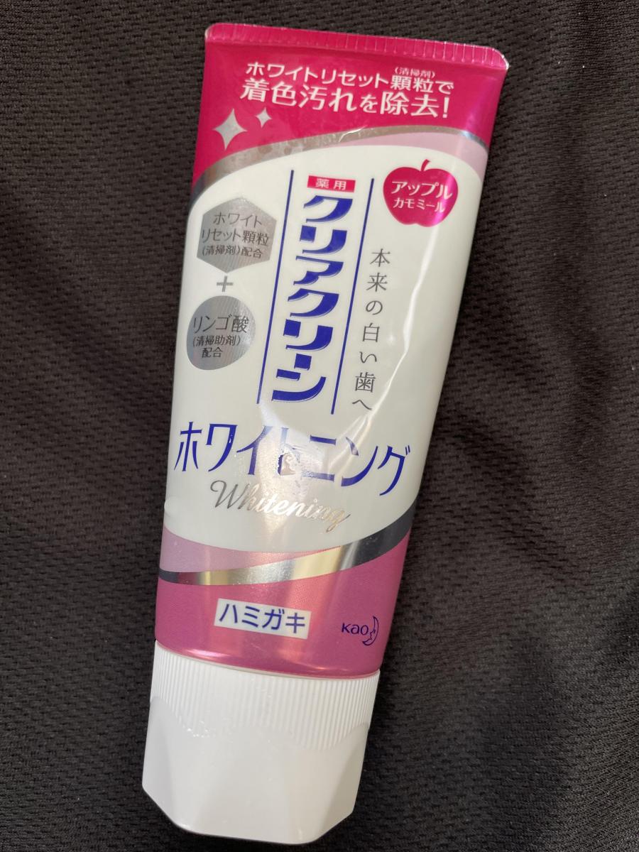 可愛らしいピンク色のパッケージが店頭で目を惹き、アップルカモミールの風味がどんな感じなのか気になったので購入しました。甘めの華やかな香りが心地よく、ホワイトリセット顆粒の効果で歯を磨いた後は口の中がスッキリとします。ミントの刺激もそれほど強くないので辛い歯磨き粉が苦手な方にはオススメです。お値段もそれほど高くないのでホワイトニング効果はあまり期待できませんが、継続して使用することで少しでも白い歯になればいいなという気持ちで使っています。