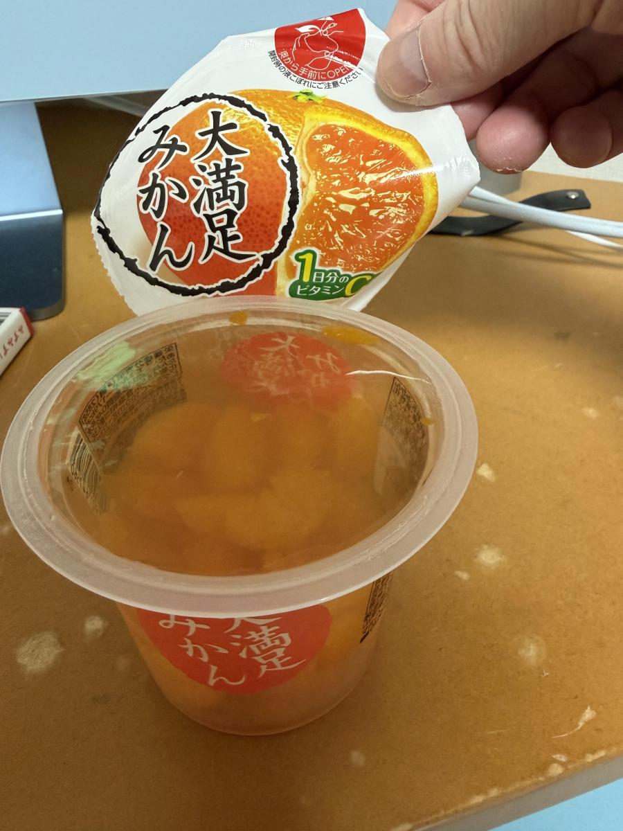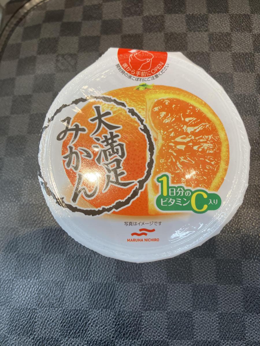暑い日に冷たいゼリーが食べたくなってコンビニで購入しました。どでかいカップにゼリーとミカンの果肉が入っています。ずっしりと重たいです。ゼリーはツルンと口当たりが良く、熱った体をクールダウンしてくれました。1日分のビタミンCも摂れるそうです。商品名の通り大満足。美味しかったです!