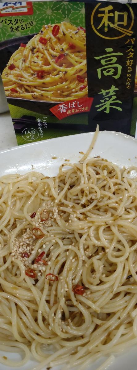 高菜をパスタにするなんて、私の中には無かった組み合わせ。一度試しに買って美味しかったので、今回2回目の購入です。茹でたパスタにソースをかけて混ぜるだけなので楽チンです。ペペロンチーノと和風を半々にしたような味付けです。がっつり和風では無かったです。トッピングはごまと輪切りの鷹の爪です。結構たくさん鷹の爪が入っていたので、お子様が食べるときにはお気をつけ下さい。前に買った時は、もう少し高菜の味がしてたような気がします。レシピ通り100グラムのパスタで作ったけど、今回はなかなか塩味が強くて、もう少しパスタ増量すれば良かったと食べながら感じました。前回と内容変わったのかな??1回目が結構美味しかったので、今回はちょっとうーんな感じになってしまいました。