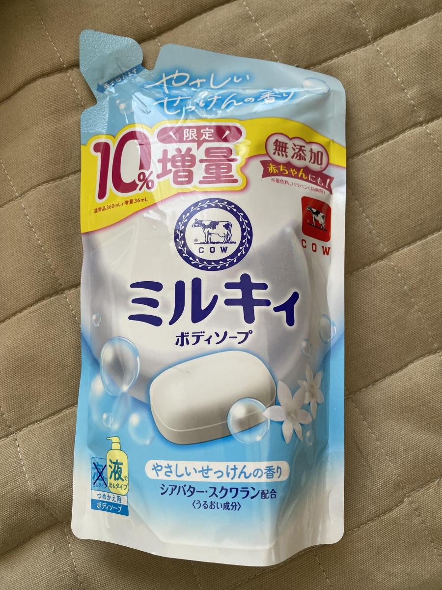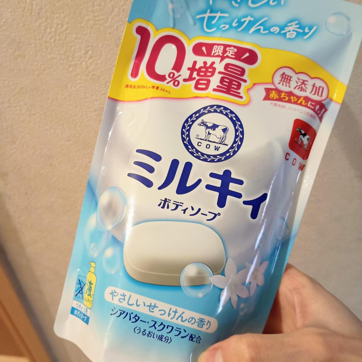 今までは同カウブランドのバウンシアや牛乳石鹸を使ってたけど、バウンシアはかなりのしっとり、牛乳石鹸は泡立ちの物足りなさが気になり、その中間っぽいミルキィボディソープを購入。