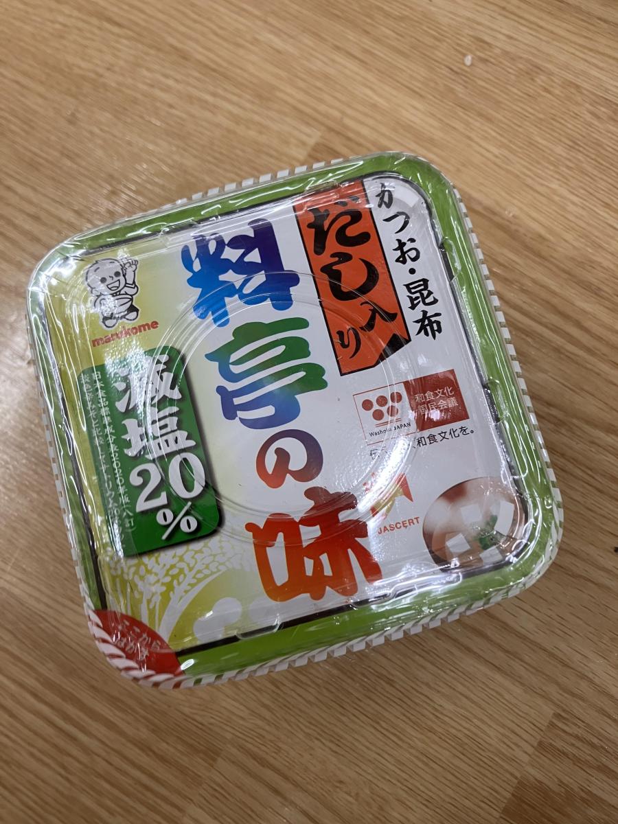 ロングセラーのお味噌のマルコメ料亭の味の減塩タイプです。やや味わいが薄めに感じますが、かつおや昆布の出汁がしっかり効いていて、旨みには遜色ありません。