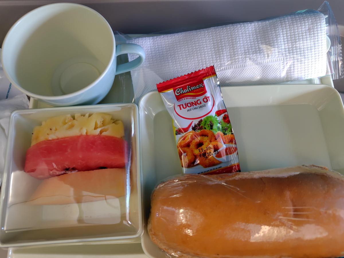 2時間弱のフライトでしたが国際線のため機内食までサービスいただけました。往復ともにバインミー(というかサンドイッチ?)でチリソース付きなのがアジア感があってよかったです。甘めのパン生地で結構おいしかったです。